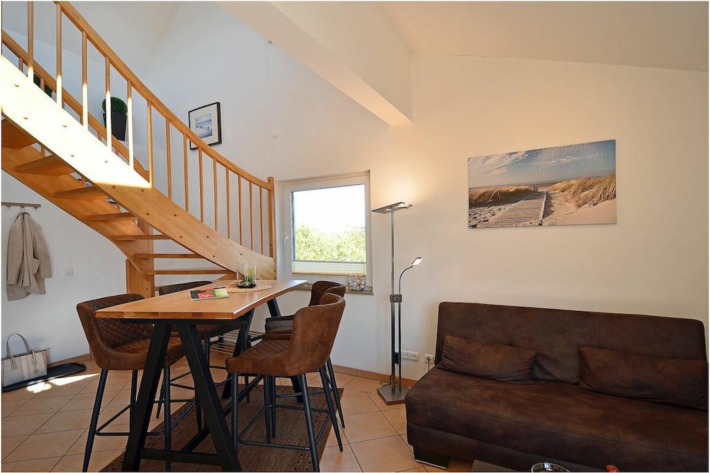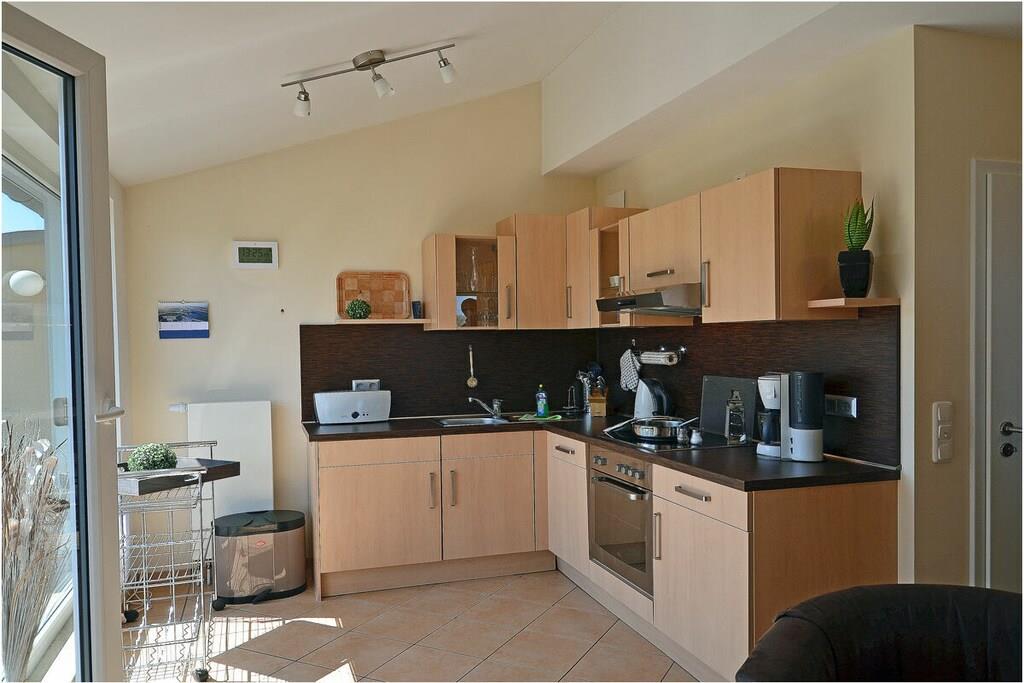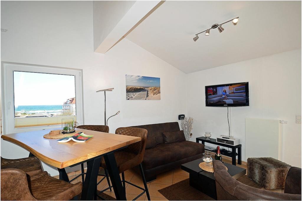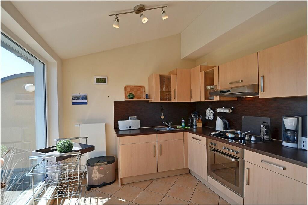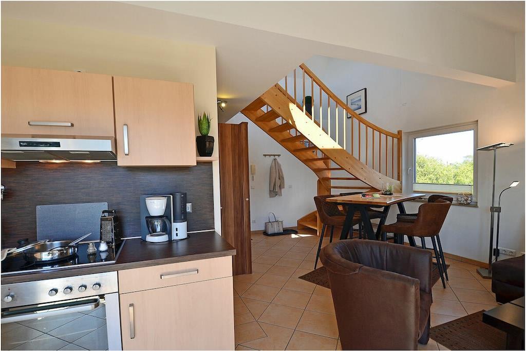 Eingangsbereich für Garderobe mit Kleiderschrank, Hauswirtschaftsraum und Staubsauger Wohn- & Essbereich mit gemütlicher Sofalandschaft mit Schlaffunktion 200cm x 140cm, Balkonzugang, TV/Sat (Flachbildschirm), Radio mit CD, DVD-Player, kostenfreies WLAN vorhanden, moderne offene komplett ausgestattete Einbauküche mit 4-Plattenherd (Ceranfeld), Backofen, Geschirrspüler, Kühlschrank mit kleinem Gefrierfach und diversen Elektrogeräten Schlafzimmer im Obergeschoss auf Galerie mit Meerblick, modernem Boxspringbett (2 Matratzen je 200cm x 90cm), Fliegengitter Badezimmer mit Dusche/WC, Handtuchhalter, Haarfön, Spiegel und Fenster Balkon mit Meerblick, Tisch mit vier Stühlen und Sonnenschirm Tiefgarage PKW-Stellplatz und Fahrradabstellmöglichkeit Fahrstuhl