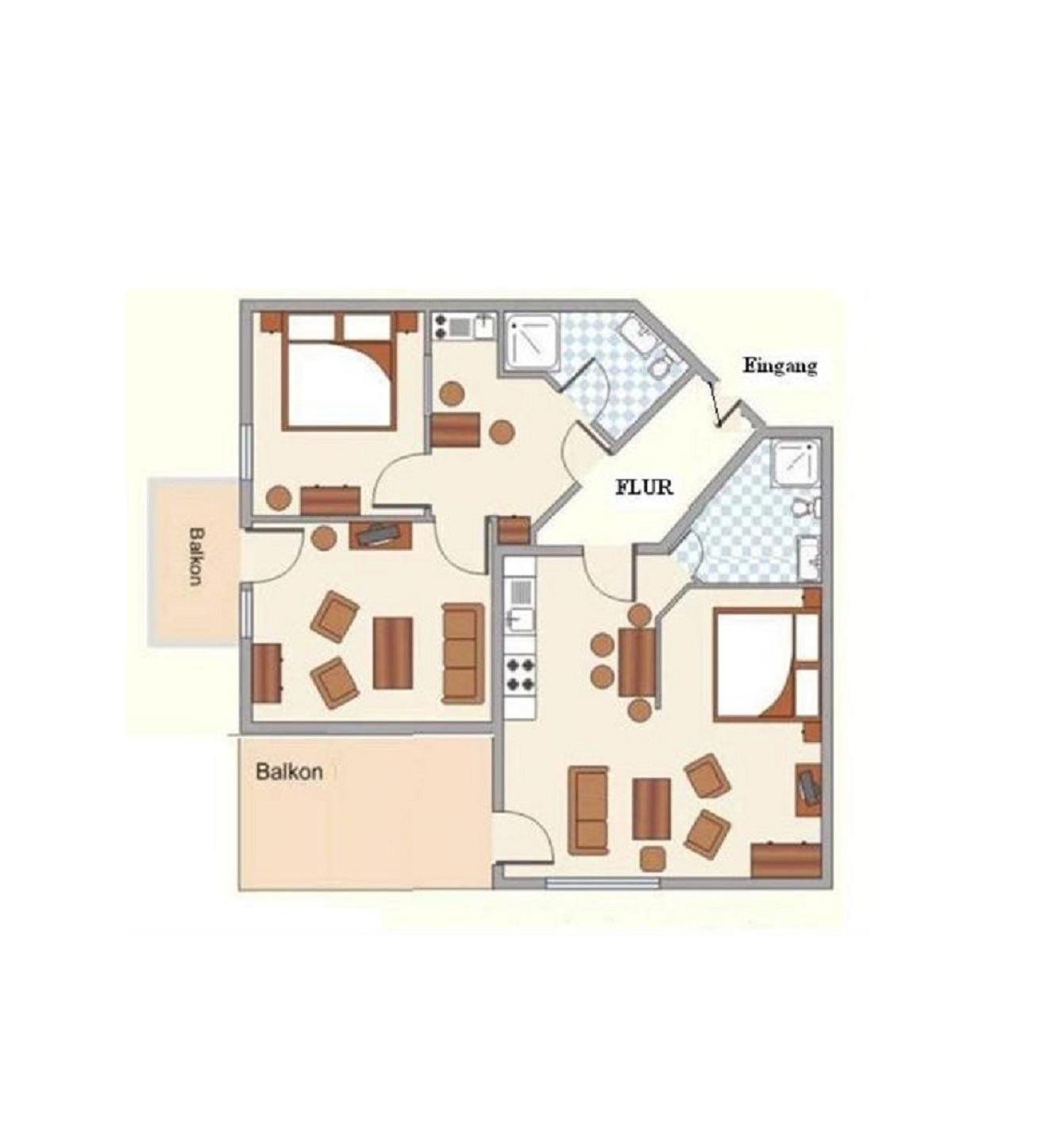 Es stehen Ihnen 2 Wohn/Schlafzimmer eines mit kompletter Küchenzeile, ein Schlafzimmer mit Doppelbett, zur Verfügung, sowie eine extra Kitchinette mit Essecke. 2 Badezimmer mit Dusche/WC und Spiegelschrank und Fön. Im Flur finden Sie die Garderobe und einen Abstellschrank.