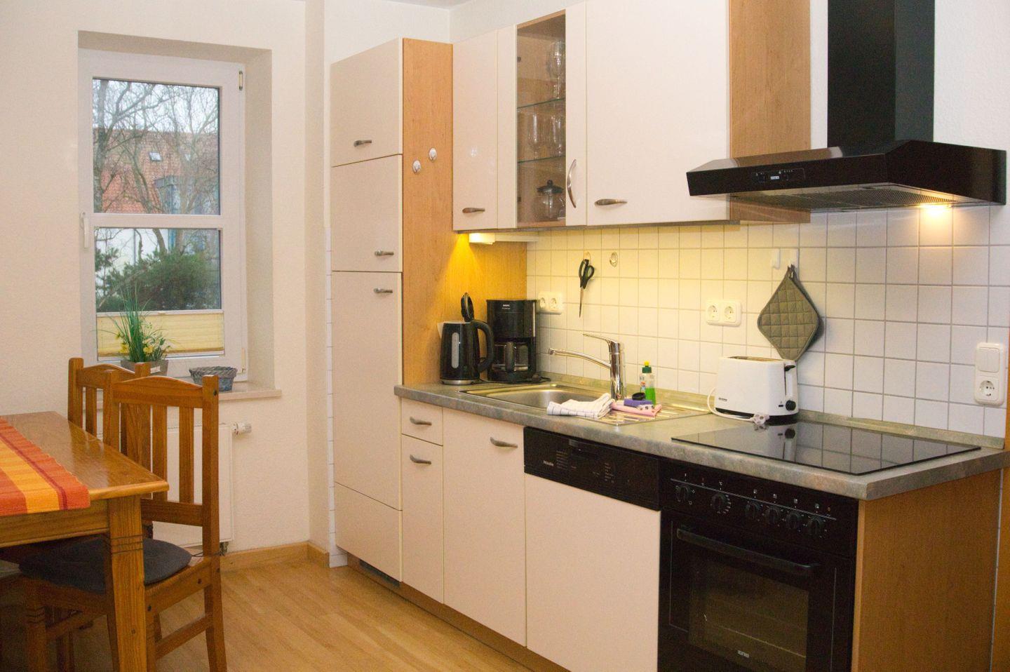 KÜCHE // Küchenzeile, 4-Platten Ceranherd, Spülmaschine, Kühlschrank mit Gefrierfach, Backofen, Toaster, Wasserkocher, Kaffeemaschine, reichlich Besteck, Geschirr und Küchenutensilien ++