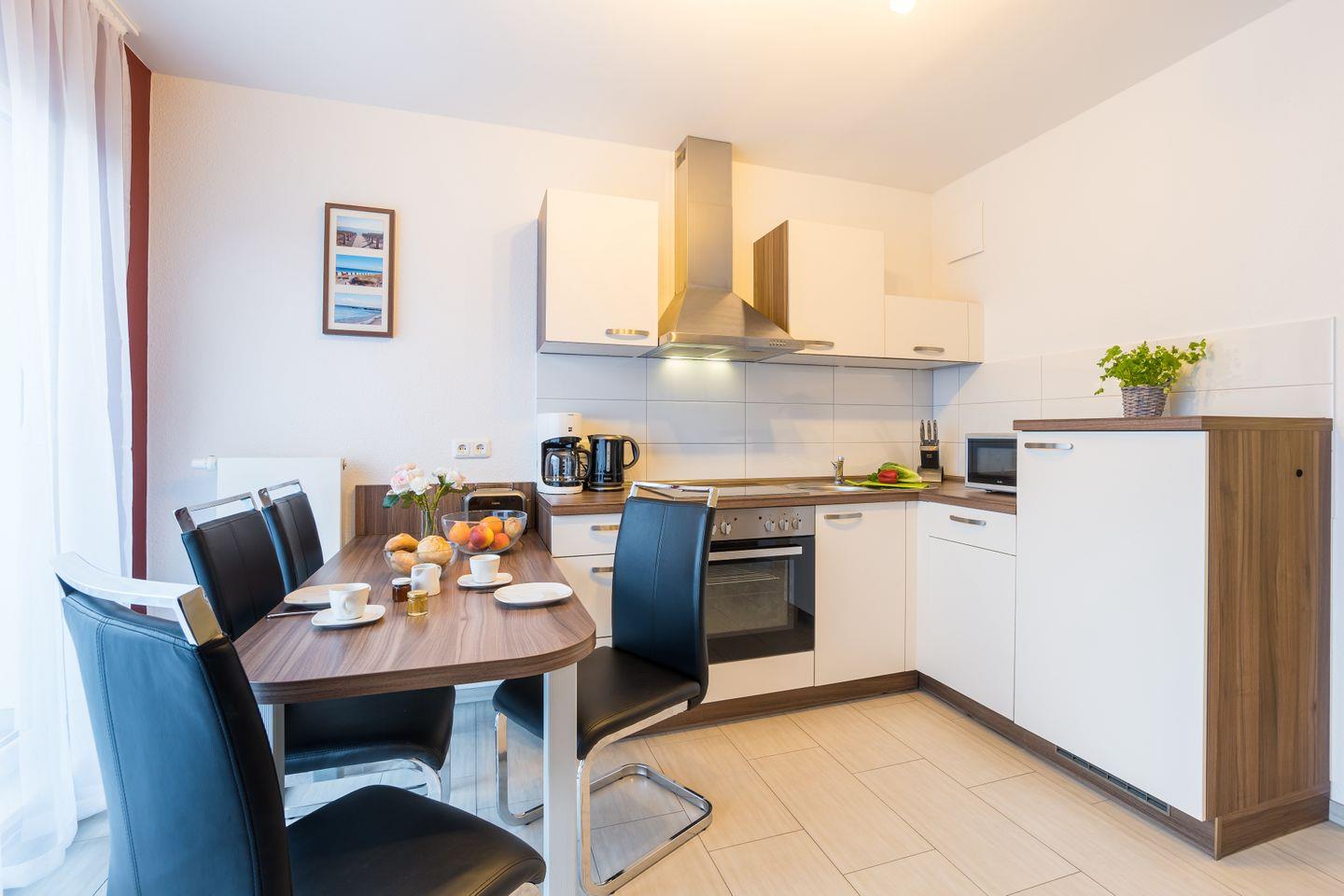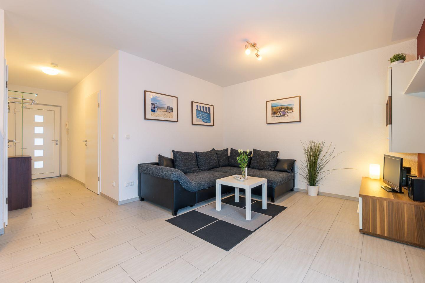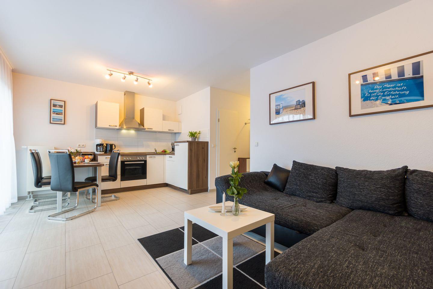 Genießen Sie entspannte Tage in der Ferienwohnung „Dünenrose“, nur wenige Meter vom 10 Kilometer langen Sandstrand der Schaabe entfernt. Die moderne Ferienwohnung bietet auf 50 Quadratmetern Platz für bis zu vier Personen und ist barrierefrei zugänglich. Der helle Wohnbereich mit Schlafcouch und SAT-TV öffnet sich zum sonnigen Südbalkon – perfekt, um abends das Meeresrauschen zu genießen. Die offene, voll ausgestattete Küche und der Esstisch für vier Personen laden zu gemeinsamen Mahlzeiten ein. Für ruhige Nächte sorgt das separate Schlafzimmer mit Doppelbett. Das Badezimmer ist modern und komfortabel mit Dusche und Fenster ausgestattet. WLAN und ein Tiefgaragenstellplatz stehen kostenfrei zur Verfügung. Die Nichtraucherwohnung ist haustierfrei und bietet damit die beste Umgebung für eine unbeschwerte Auszeit an der Ostsee.