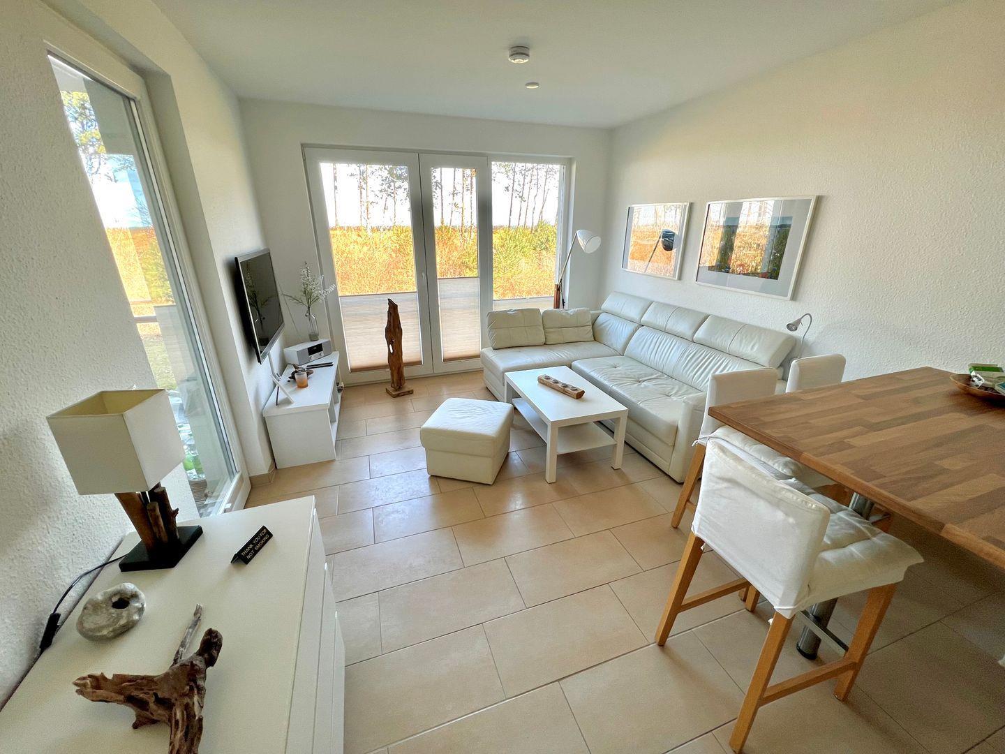 Charmante Ferienwohnung Bernstein mit Balkon und direkter Strandlage an der Schaabe auf Rügen.