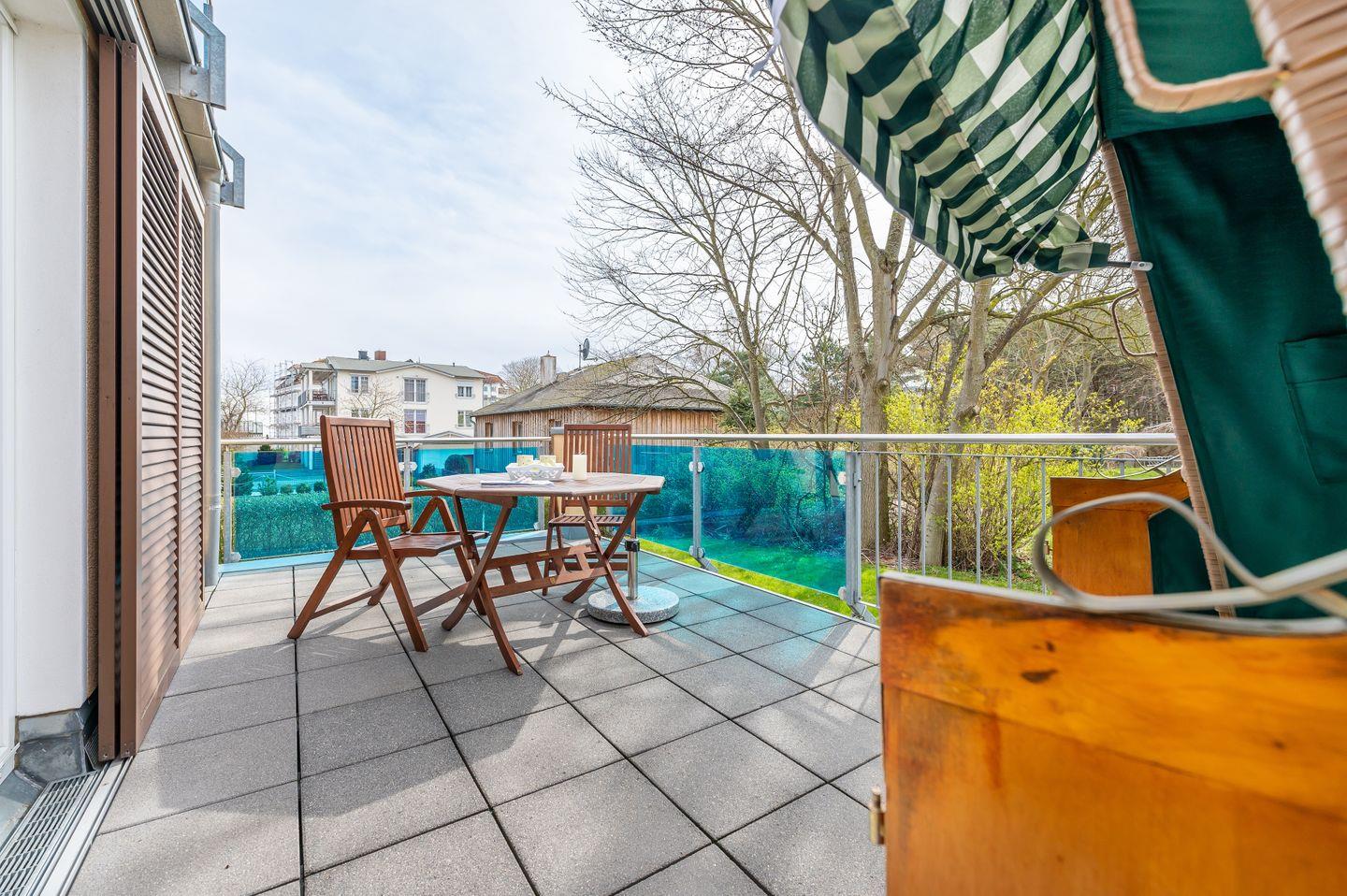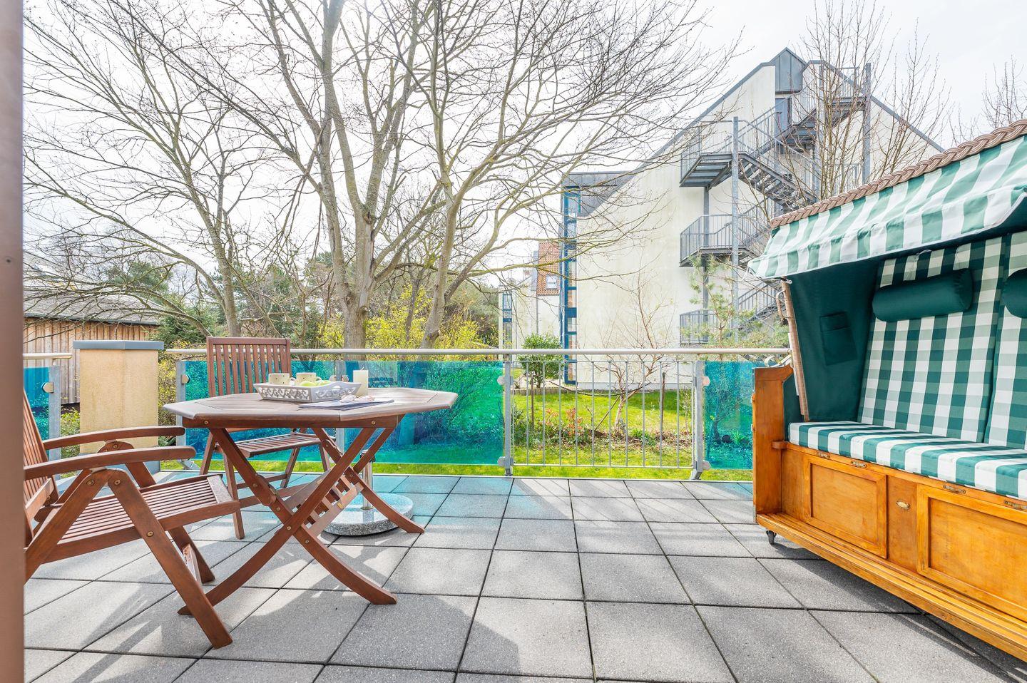 Verbringen Sie unvergessliche Urlaubstage in dieser modernen Ferienwohnung, die Sie dank bodentiefer Fenster mit viel Tageslicht begrüßt. Die komplett ausgestattete Küche bietet alles, was Sie für gemütliche Kochabende benötigen. Auf der möblierten Südterrasse mit eigenem Strandkorb können Sie die Sonne genießen und entspannte Stunden im Freien verbringen. Ein Kinderbett (ohne Bettzeug) und ein Kinderhochstuhl stehen zur Verfügung. Ein Tiefgaragenstellplatz direkt am Haus rundet den Komfort dieser Wohnung ab.