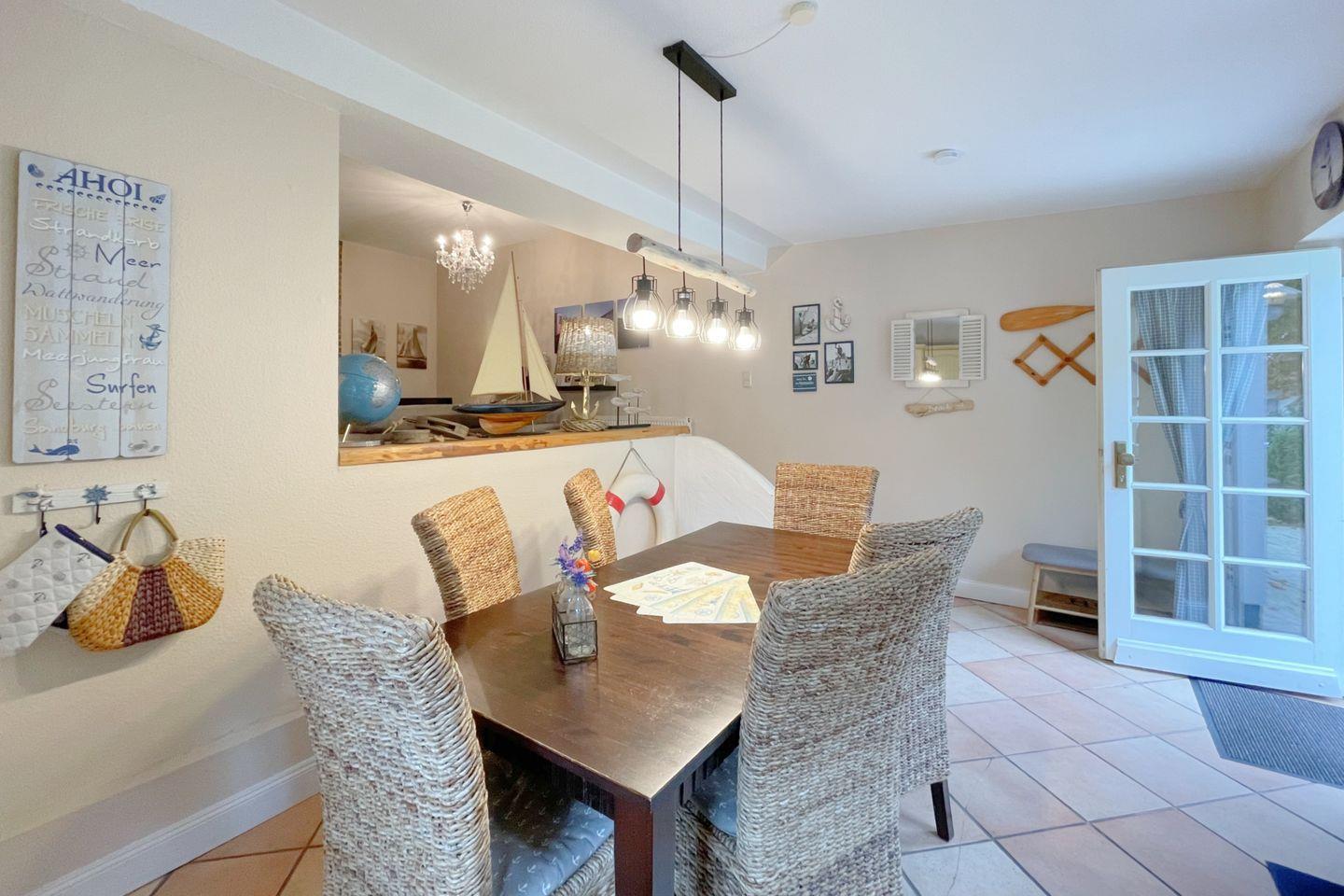 Die Ferienwohnung bietet auf großzügigen 65 m² Platz für bis zu vier Personen. Sie ist modern und geschmackvoll eingerichtet. Genießen Sie die Zeit in einem lichtdurchfluteten Wohnzimmer mit einer komfortablen Sofaecke, die zum Verweilen und Entspannen einlädt. Der offene Küchenbereich ist mit allen notwendigen Annehmlichkeiten ausgestattet, darunter ein Herd, ein Backofen, eine Geschirrspülmaschine und eine Kaffeemaschine. Hier können Sie gemeinsam köstliche Mahlzeiten zubereiten, während Sie den Blick auf den Garten genießen.