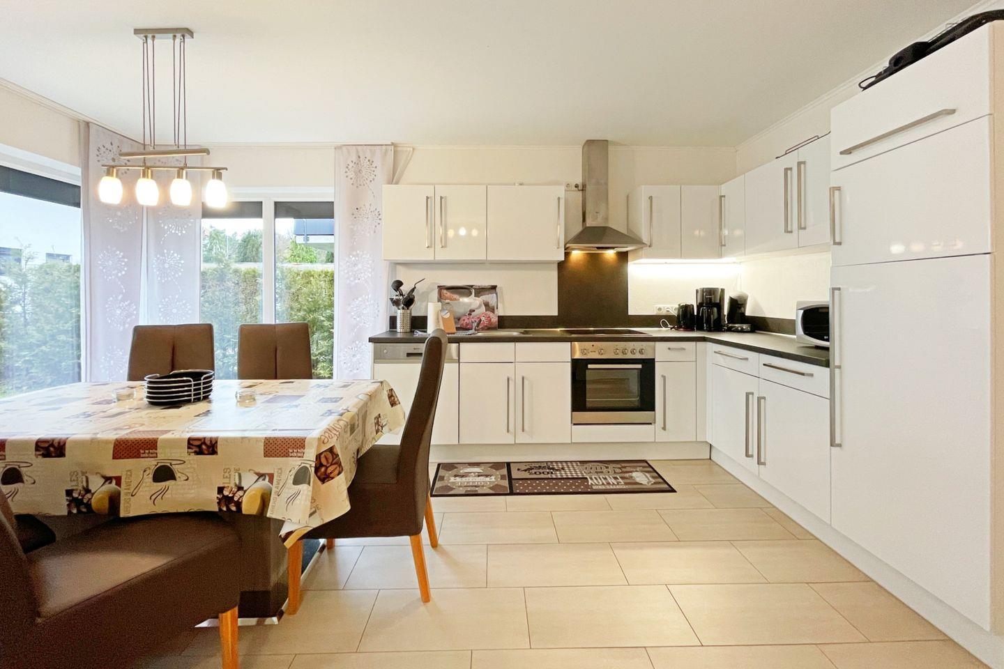 Die helle und moderne Ausstattung wird durch eine offene Küche ergänzt, die mit sämtlichen Annehmlichkeiten versehen ist, die Sie für die Zubereitung Ihrer Lieblingsgerichte benötigen – von einer Mikrowelle über einen Herd bis hin zu einer Spülmaschine. Genießen Sie Ihre Mahlzeiten am großen Esstisch oder auf der herrlichen Terrasse mit Gartenmöbeln, die zu entspannten Momenten im Freien einlädt.