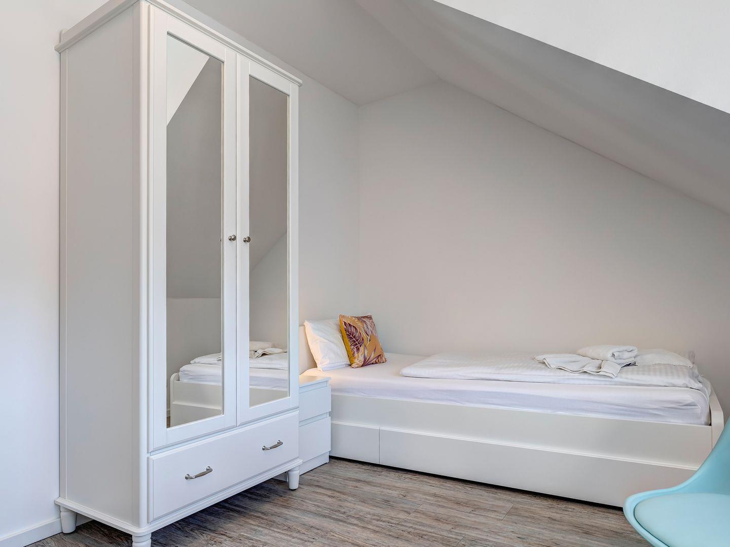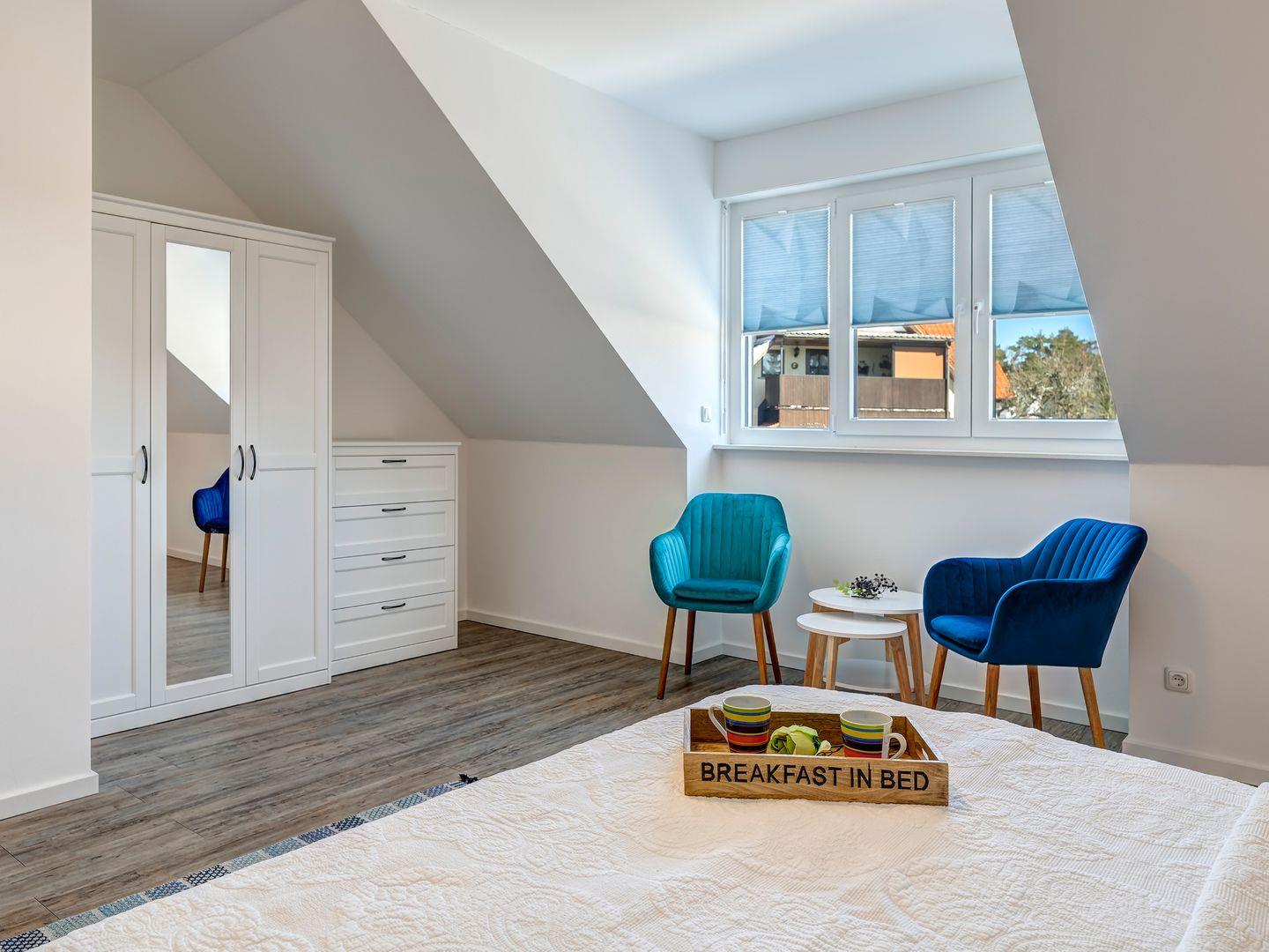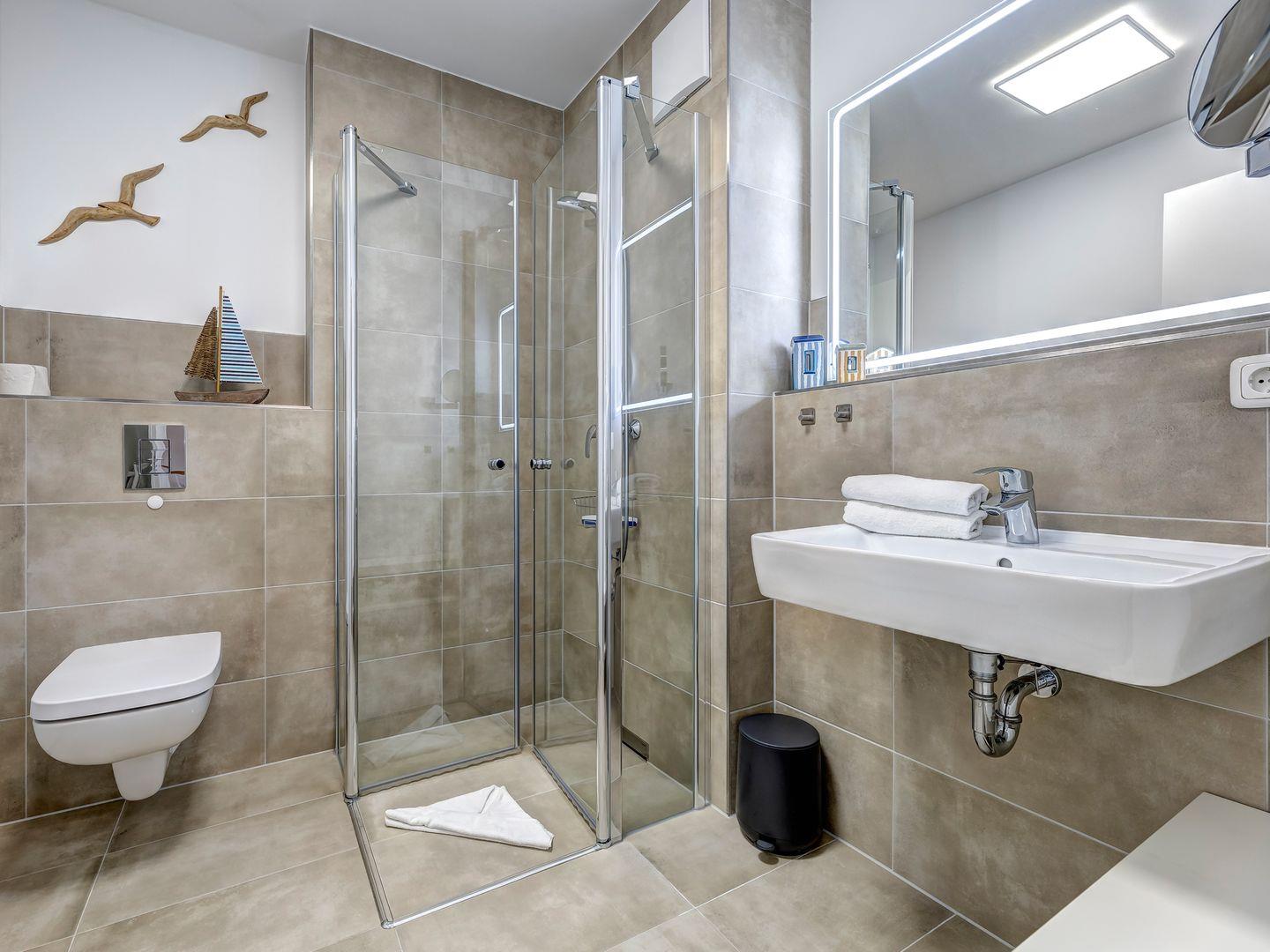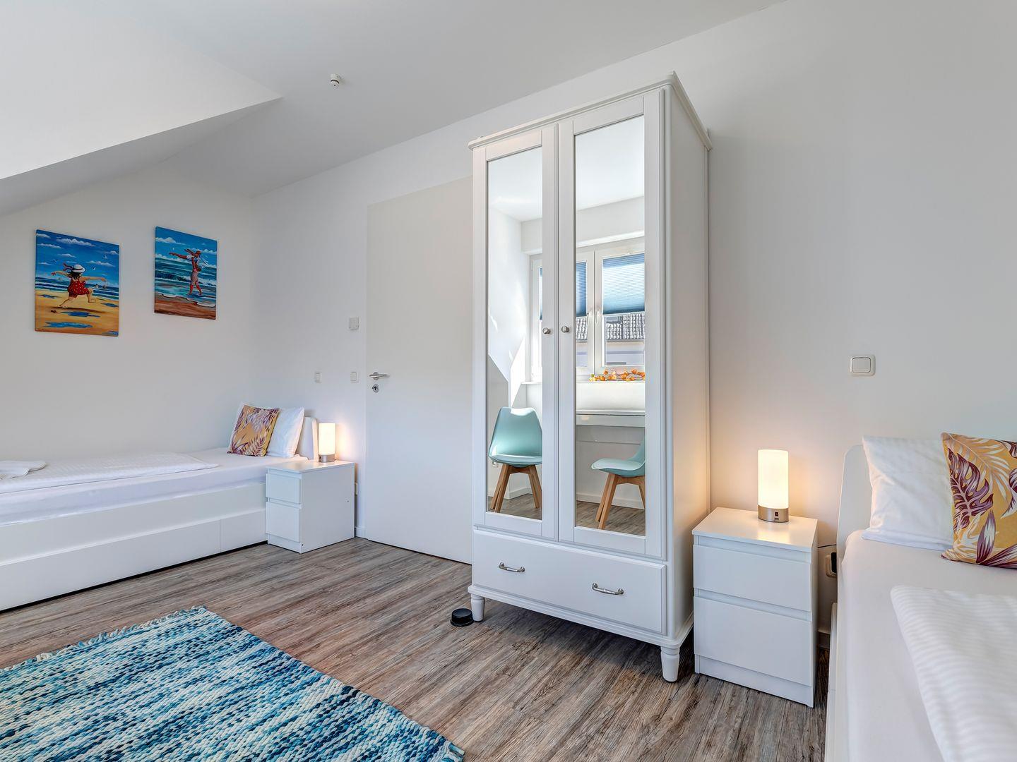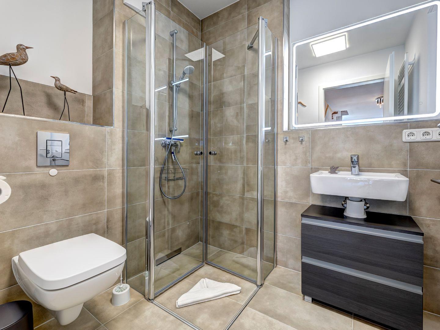 Für erholsame Nächte sorgen zwei Schlafzimmer mit insgesamt 4 Betten, die ausreichend Stauraum bieten. Auf beiden Etagen finden Sie ein Bad mit Dusche und WC. Die Betten sind bei Ihrer Anreise bereits bezogen, und auf Wunsch können Sie ein Wäschepaket (Handtücher) hinzubuchen. Ein Babybett oder ein Hochstuhl sind ebenfalls separat buchbar.