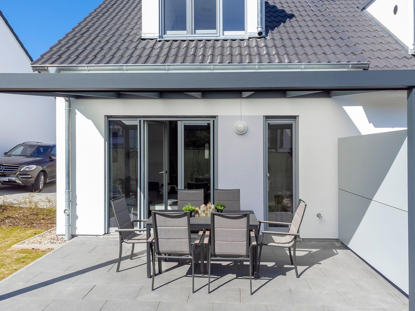 Der großzügige, offene Wohn- und Essbereich mit einer voll ausgestatteten Küche lädt zum Verweilen ein. Von hier aus gelangen Sie auf die große Sonnenterrasse, die sich auf der Südseite des Hauses befindet. Sonnenschutz und Gartenmöbel sorgen für zusätzlichen Komfort.