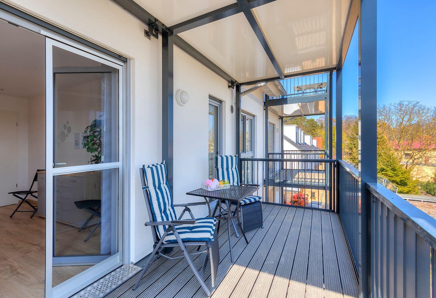 Die über 60qm große Wohnung im ersten Obergeschoss ist bequem über die Treppe oder per Lift zu erreichen. Durch ihre Südost-Ausrichtung gewährt sie einen Ausblick bis zum nahegelegenen Kölpinsee. Sowohl vom Wohn- als auch vom Schlafzimmer aus gelangen Sie auf den 10 m² großen Balkon. Hier können Sie entspannen oder den Tag bei einem Frühstück in der Sonne beginnen.