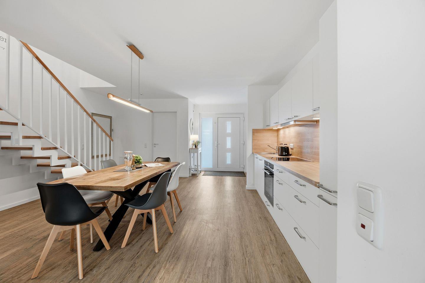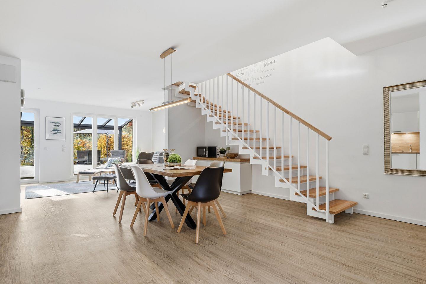 Der offene Eingangsbereich führt in den stilvollen Küchen- und Essbereich, der mit einer voll ausgestatteten, offenen Küche und einem großen Esstisch für bis zu acht Personen ausgestattet ist. Große Fenster sorgen für viel Tageslicht und bieten einen schönen Blick auf die möblierte und überdachte Südterrasse.
