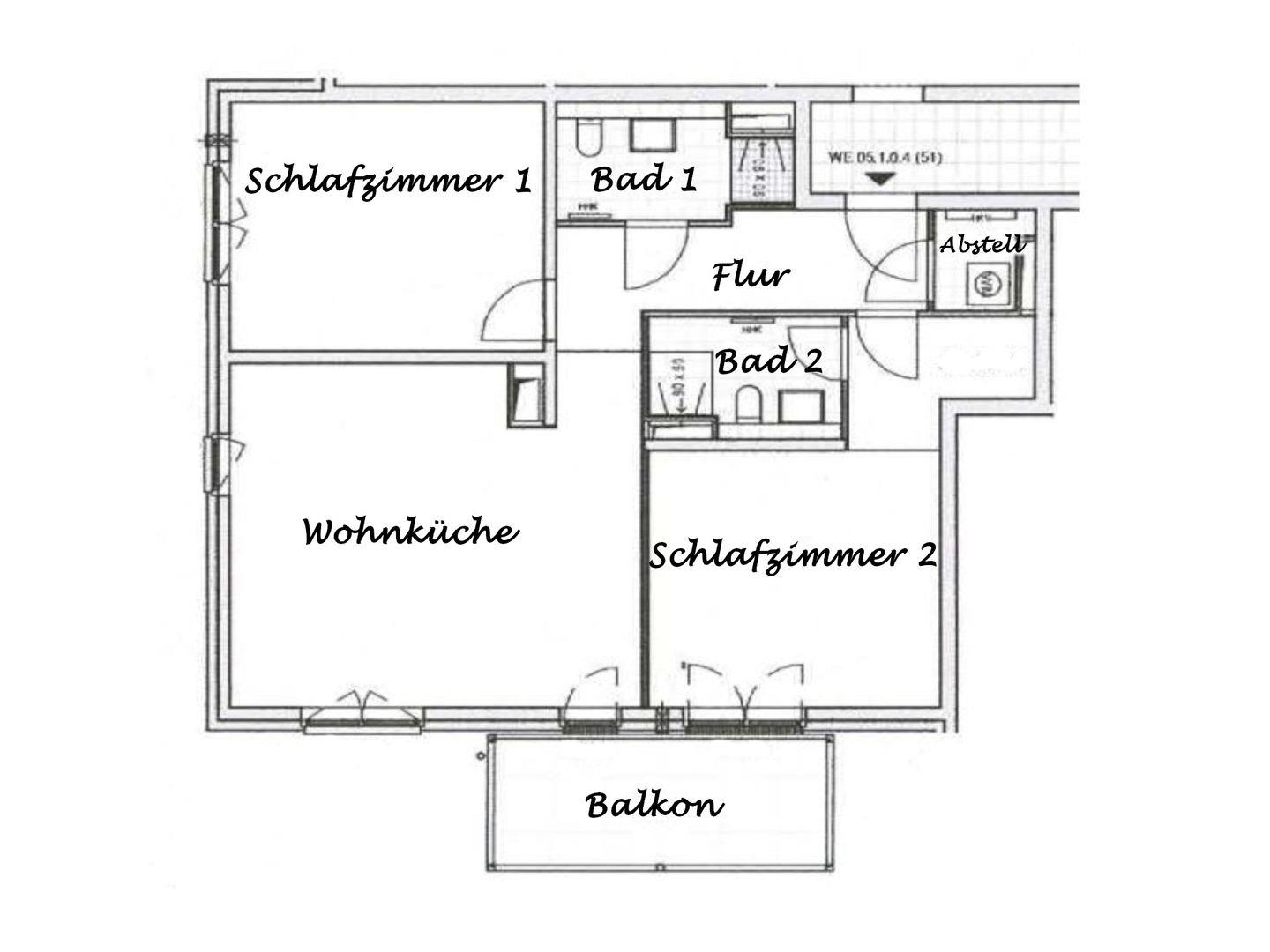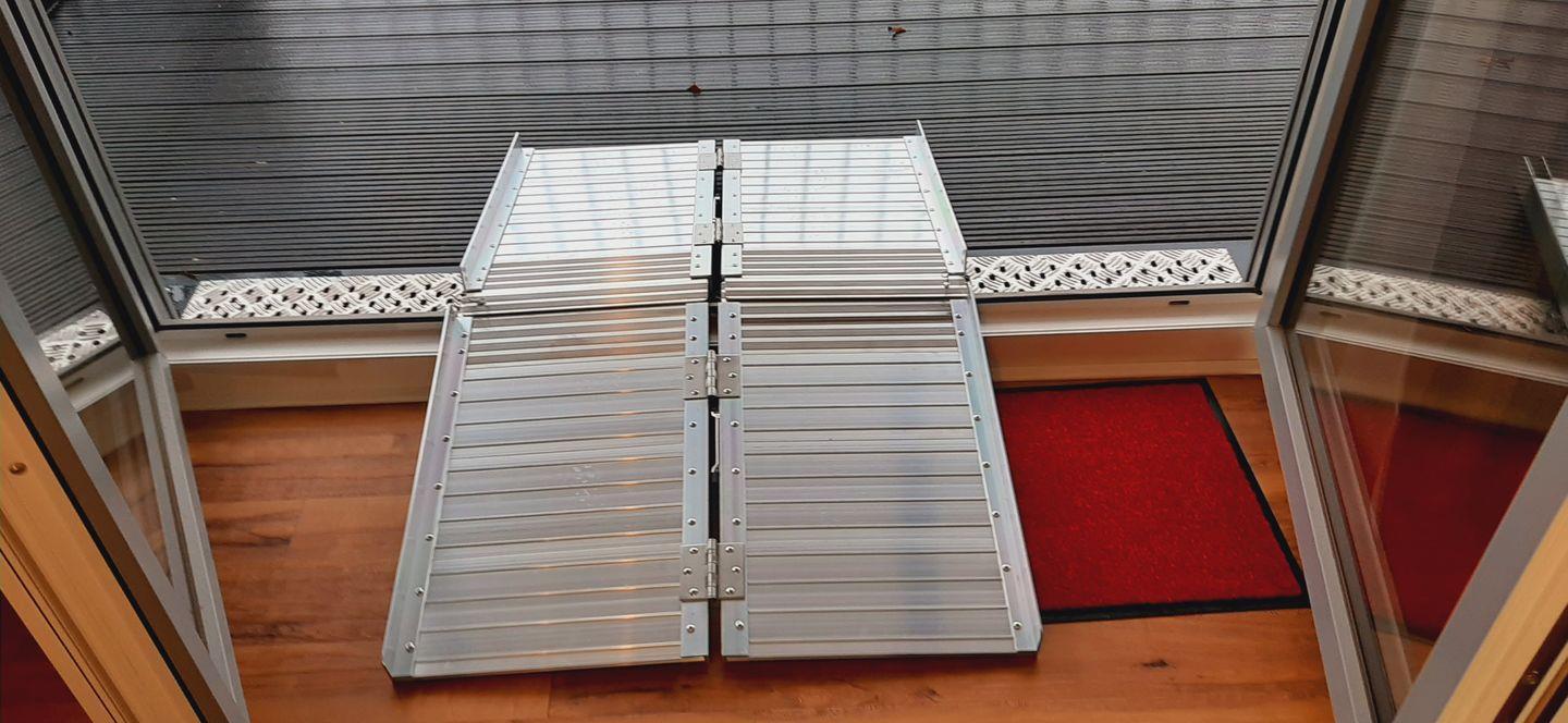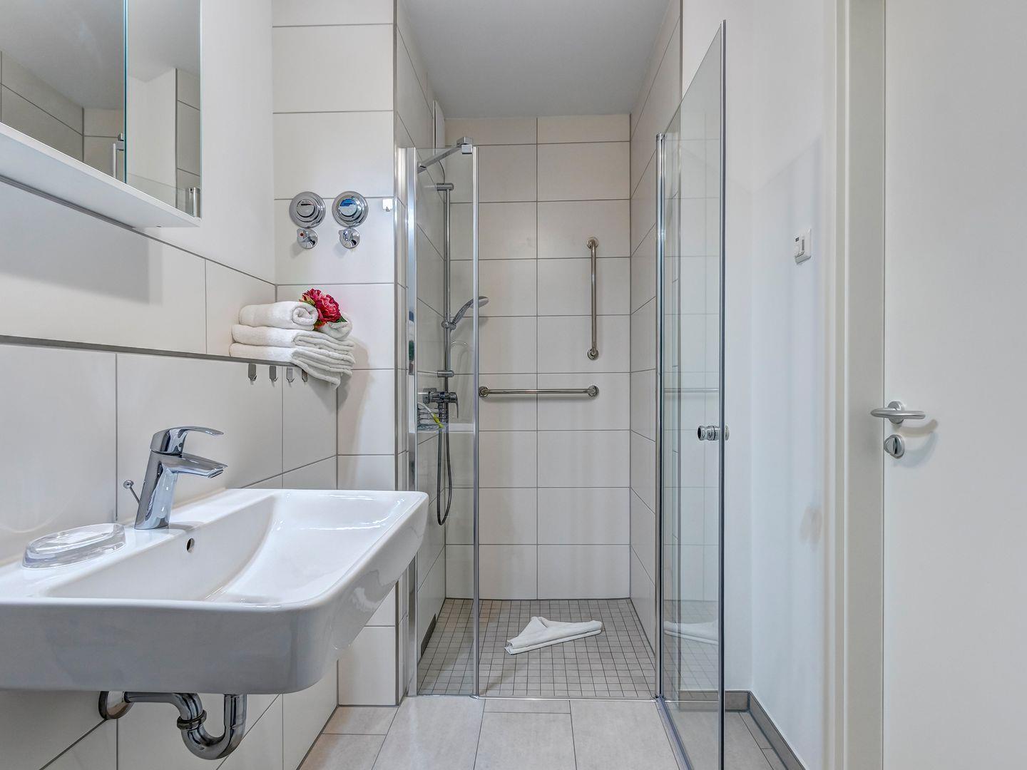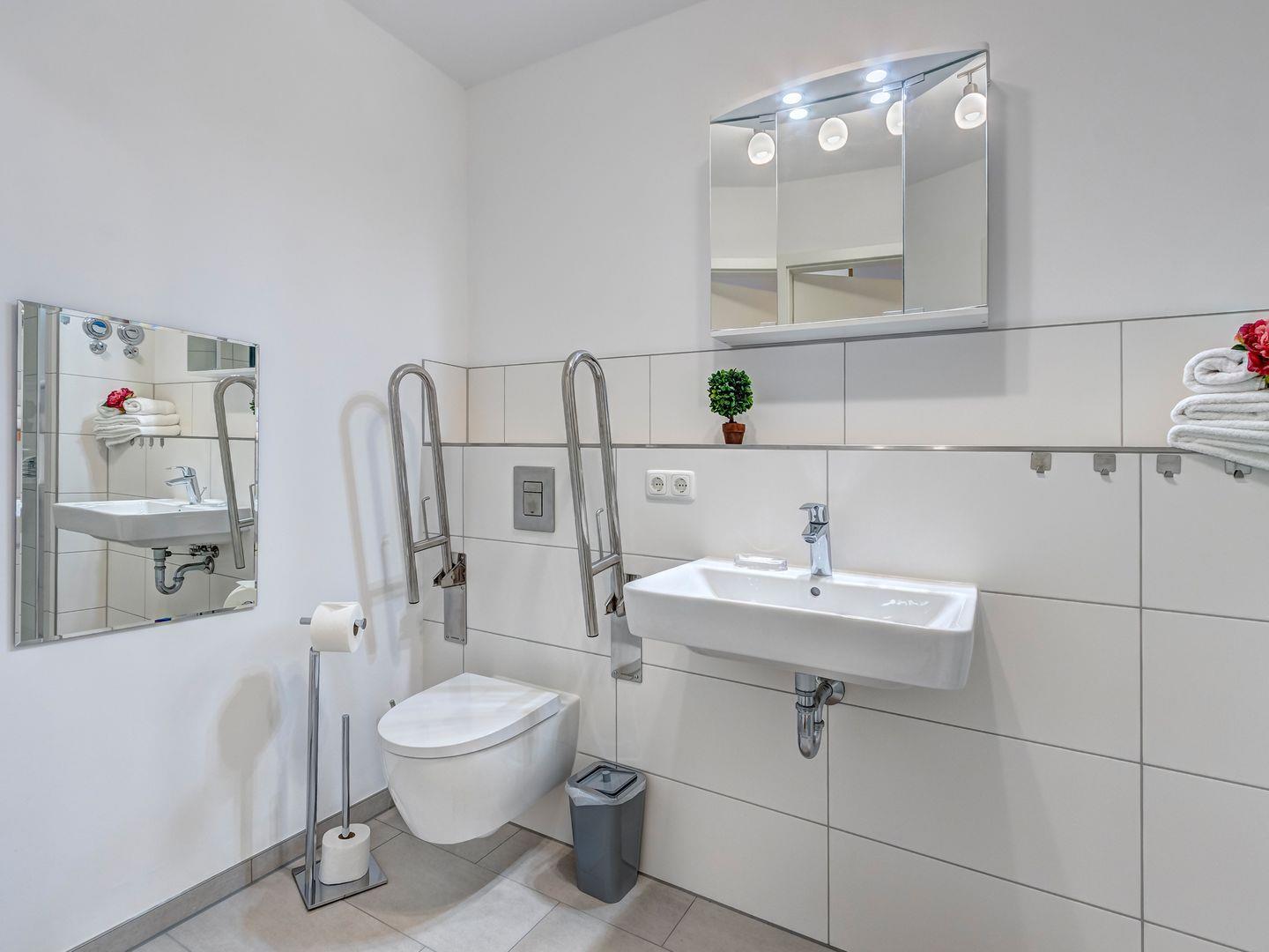 Für Rollstuhlfahrer ist die Wohnung bestens geeignet, denn im Abstellraum befinden sich mobile Aluminiumrampen, die leicht zu handhaben sind. Somit ist auch der Zugang zum Balkon für Rollstuhlfahrer problemlos möglich. Eines der beiden Bäder ist komplett als Behindertenbad ausgestattet, inklusive WC und Dusche, Duschstuhl und speziellen Duschhalterungen. Badmöbel in Mooreiche und Spiegel für Rollstuhlfahrer runden die barrierefreie Ausstattung ab.