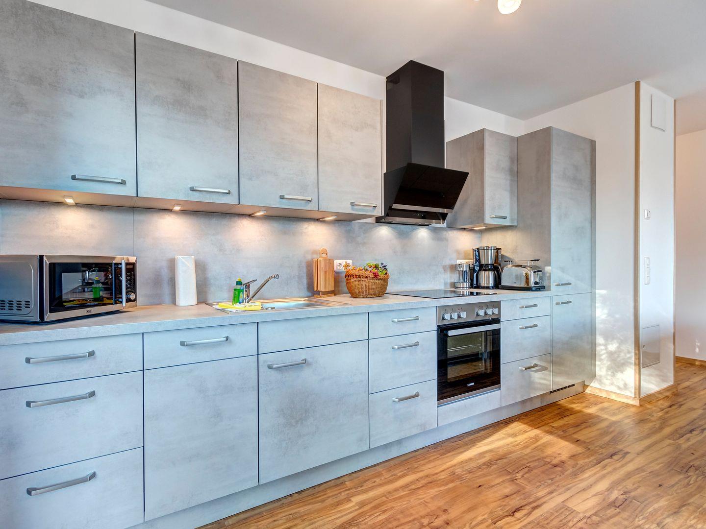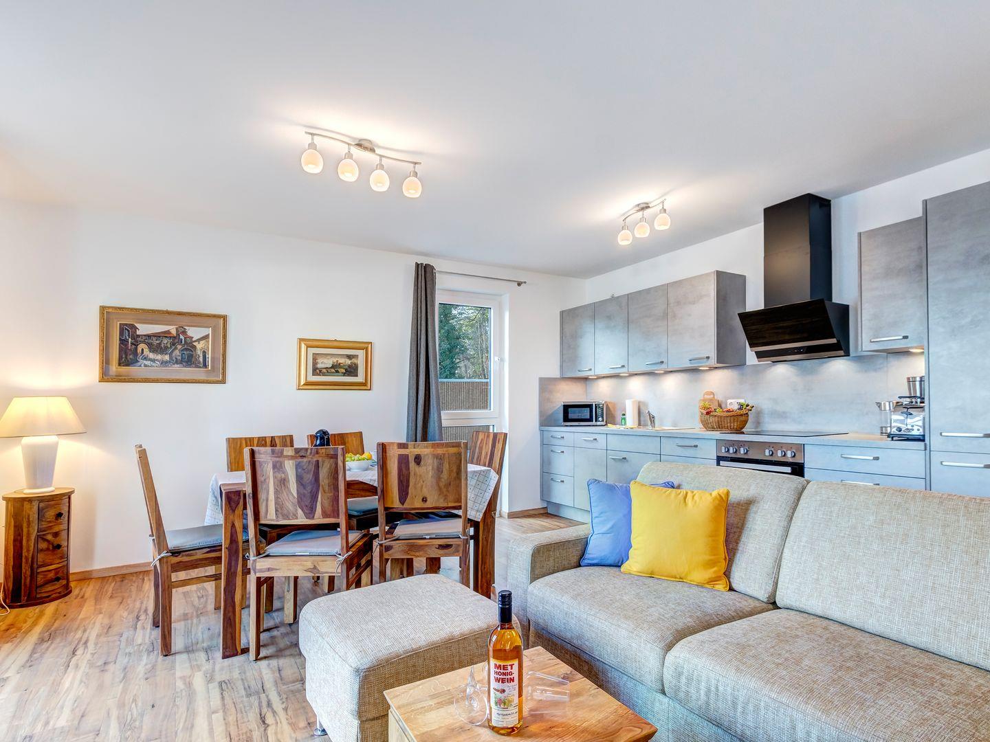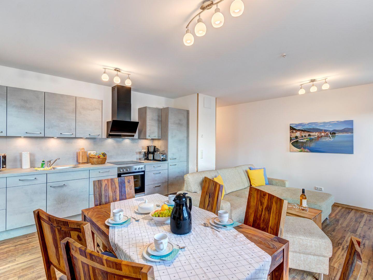 Die Ferienwohnung verfügt über zwei Schlafzimmer mit Doppelbetten sowie einer Schlafcouch für zwei Personen. Zudem steht Ihnen eine voll ausgestattete Küche zur Verfügung. Für Unterhaltung sorgen große Smart-TVs in den Wohn- und Schlafzimmern.