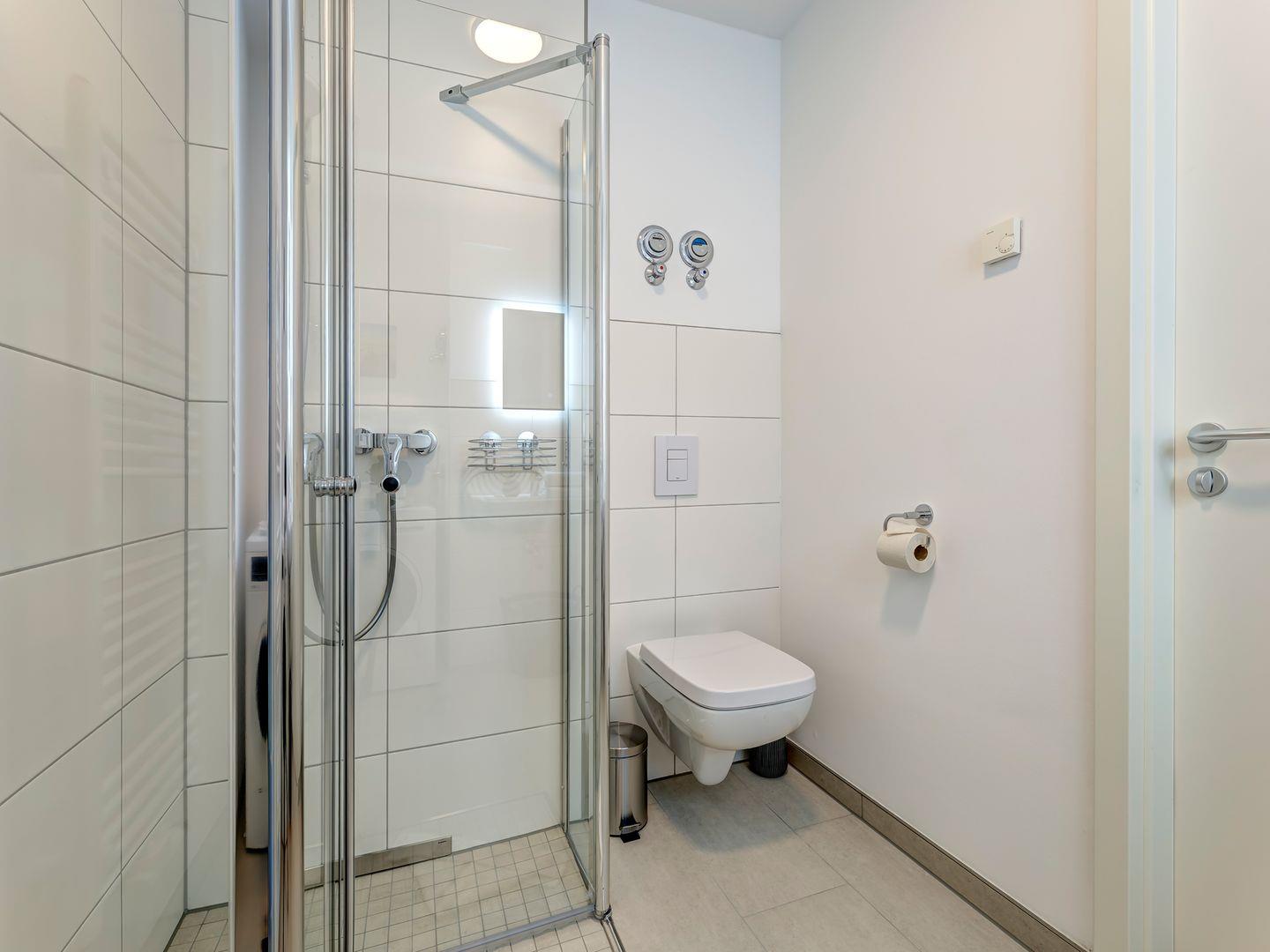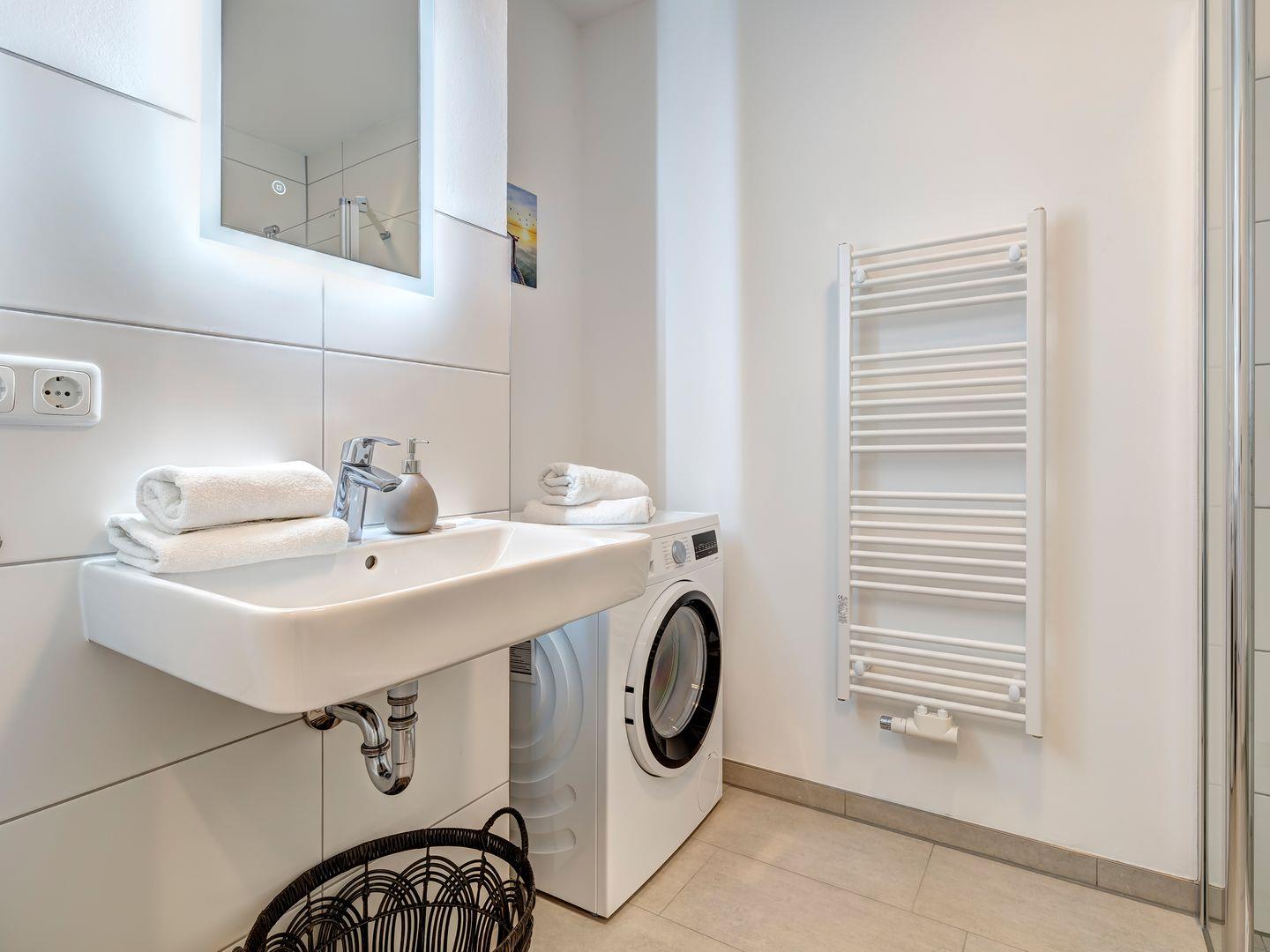 Das Badezimmer ist mit einer ebenerdigen Dusche ausgestattet und verfügt über eine Waschmaschine, um Ihnen den Aufenthalt so angenehm wie möglich zu gestalten.