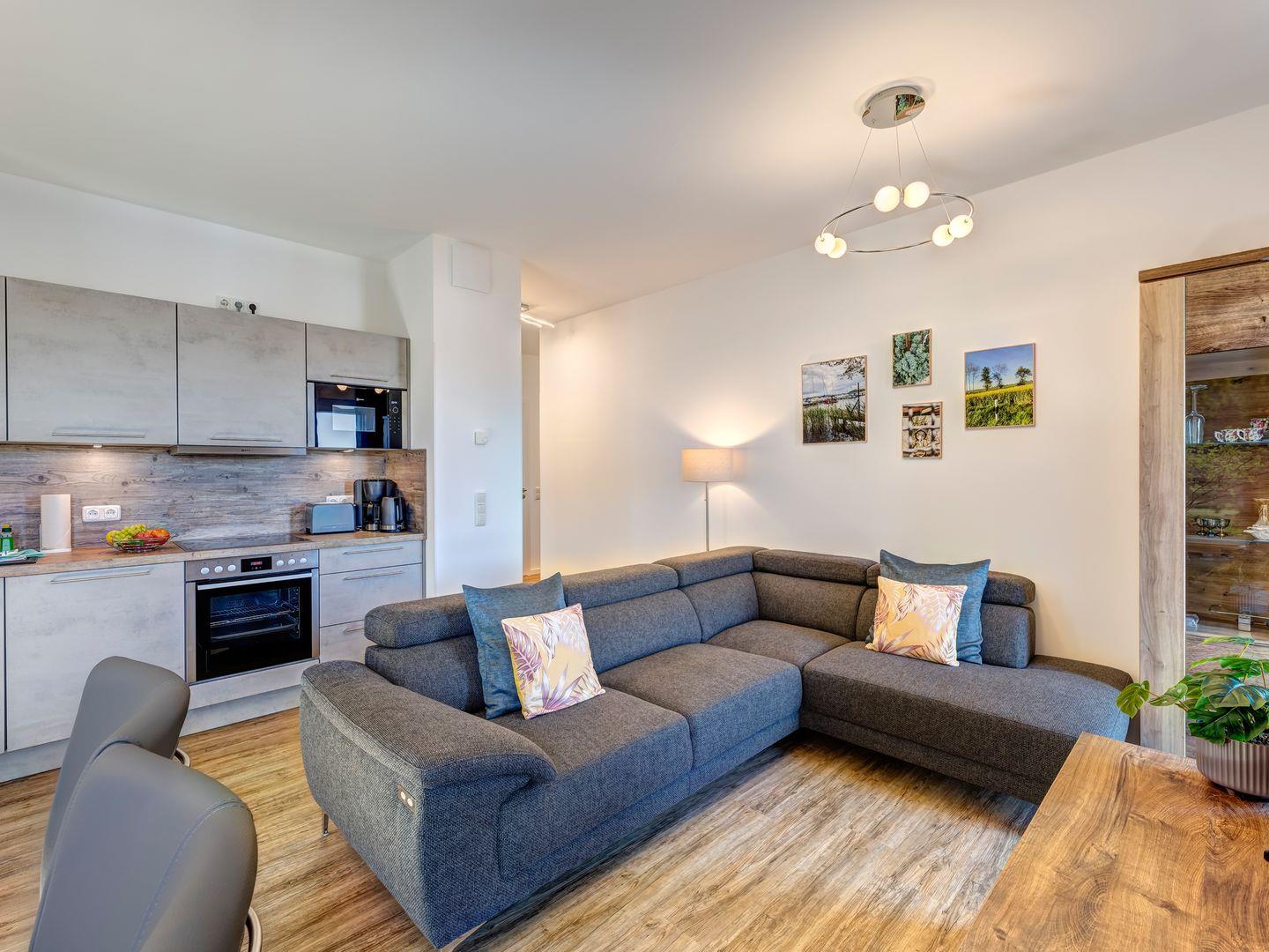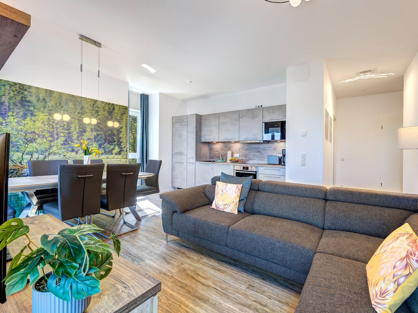 Im Wohnzimmer erwartet Sie eine gemütliche, elektrisch ausziehbare Sitzecke sowie ein Smart TV, ebenso wie im „Kinderzimmer“. Kostenfreies WLAN sorgt für Unterhaltung. Die moderne, voll ausgestattete Küche mit Essbereich lädt zu gemeinsamen Mahlzeiten ein. Zudem gibt es zwei stilvolle Duschbäder mit Fön.