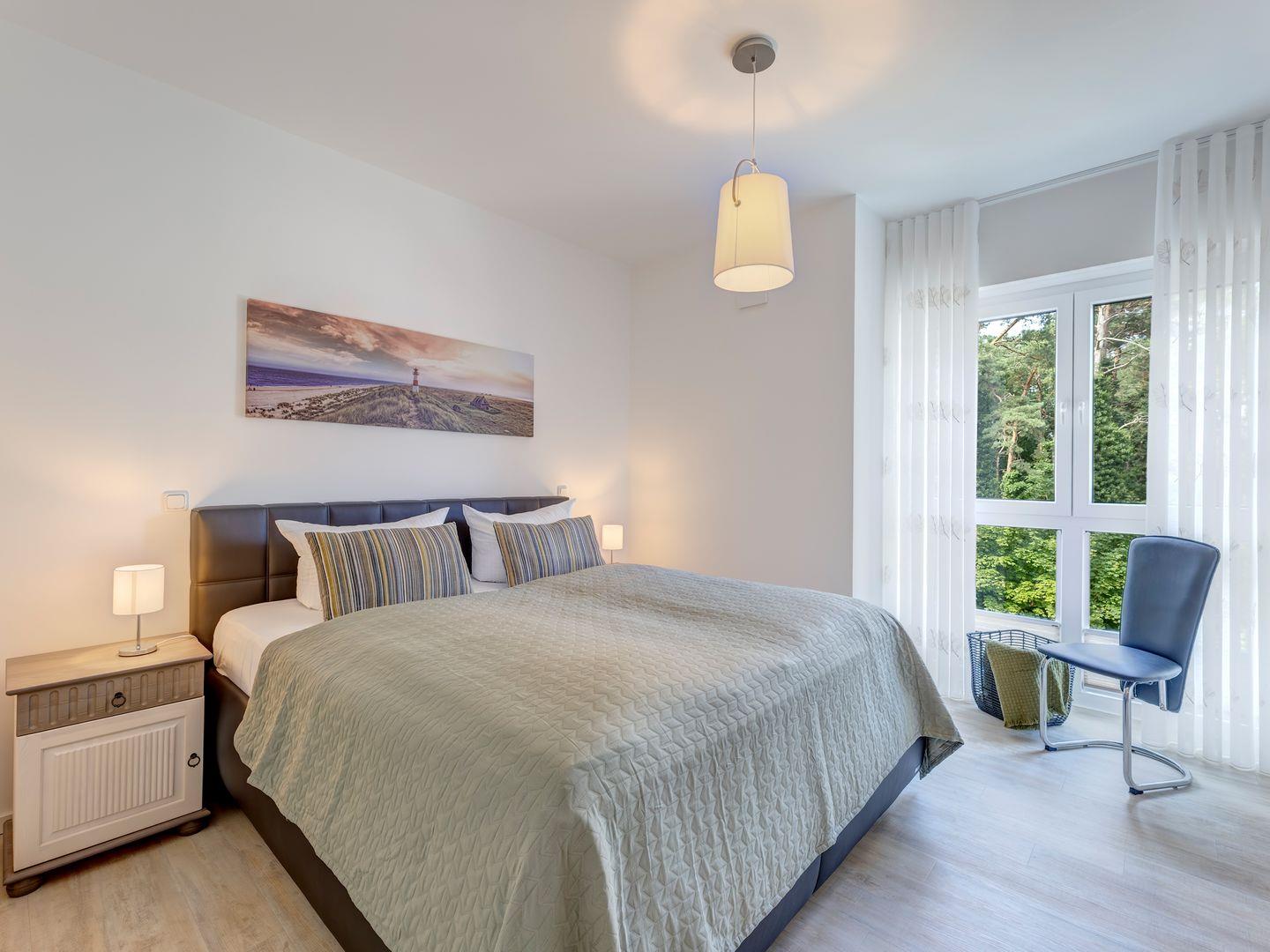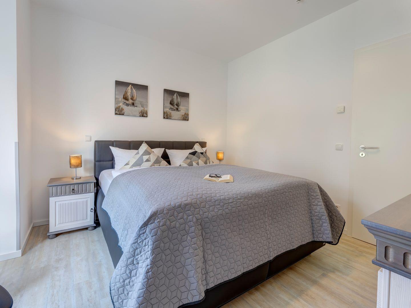 Auf Ihren erholsamen Schlaf müssen Sie auch im Urlaub nicht verzichten. Die Schlafzimmer sind jeweils mit einem Boxspringbett einem 43 Zoll Smart- TV und geräumigen Kleiderschrank und Kommoden ausgestattet. Einen direkten Zugang zum Duschbad haben Sie von einem der Schlafzimmer.