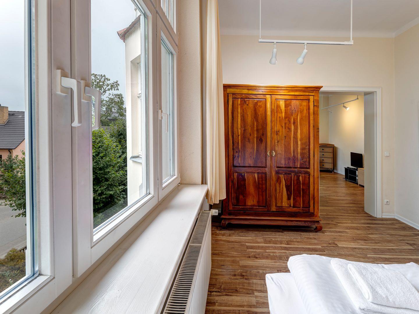- das helle Schlafzimmer ist mit zwei nebeneinander stehenden Einzelbetten ausgestattet, die durch ein gemeinsames Kopfteil verbunden sind