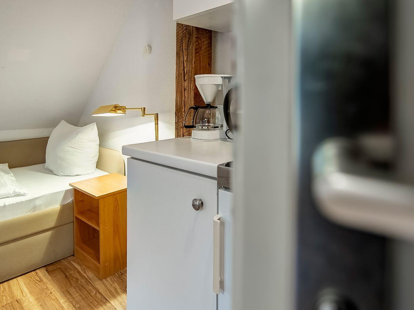 Im Wohnraum befinden sich zwei Einzelbetten, die hintereinander angeordnet sind, ein Fernseher sowie eine Pantry-Küche.