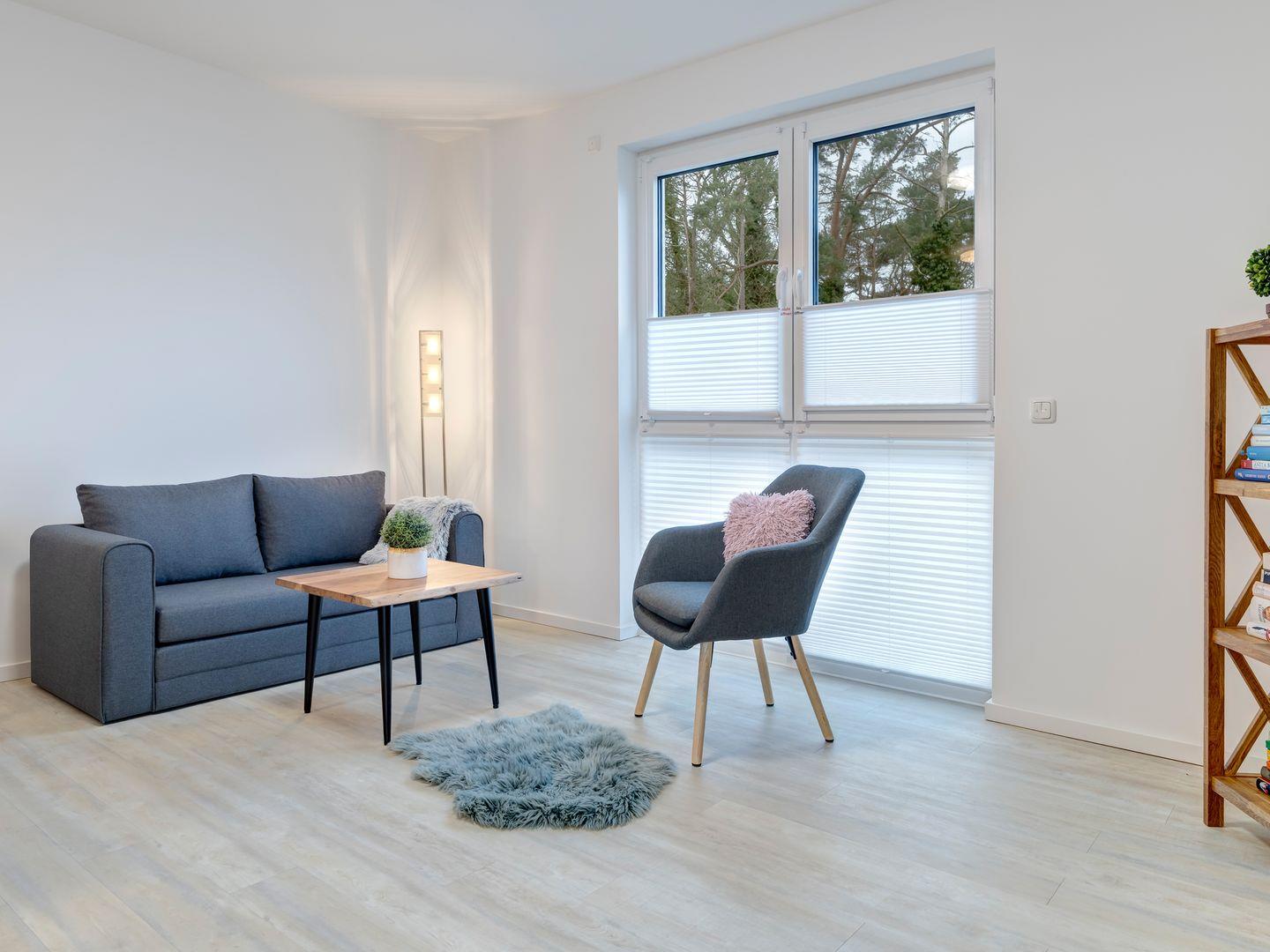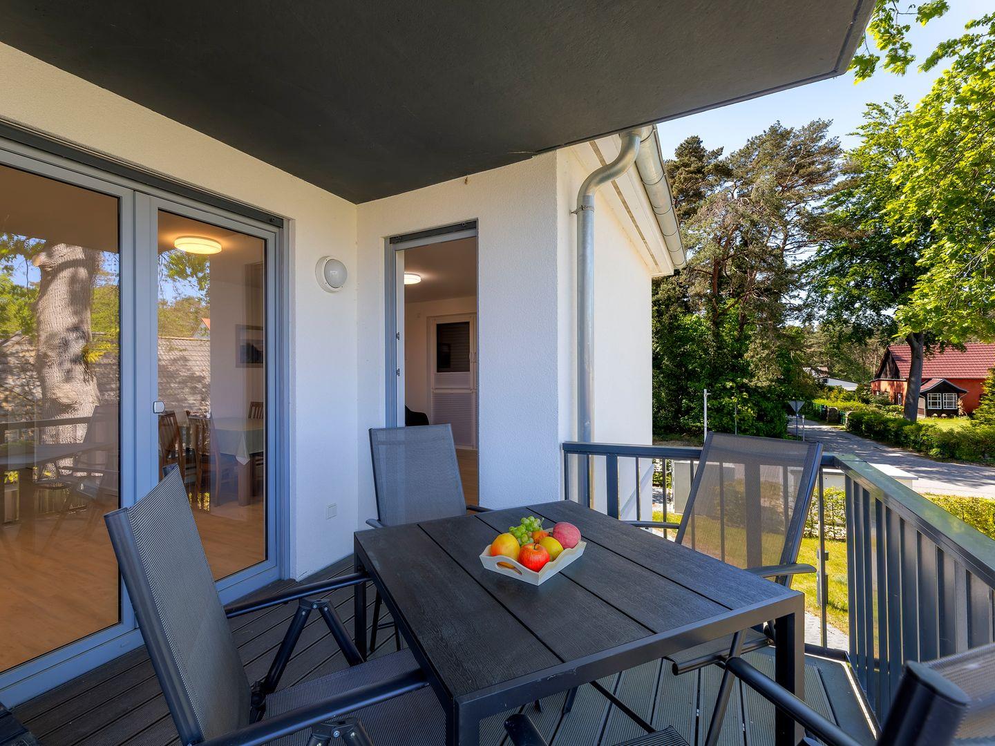 Luxuriöse Wohnung im Bernsteinquartier Kölpinsee mit Balkon, moderner Küche und Komfort für entspannte Urlaubstage.