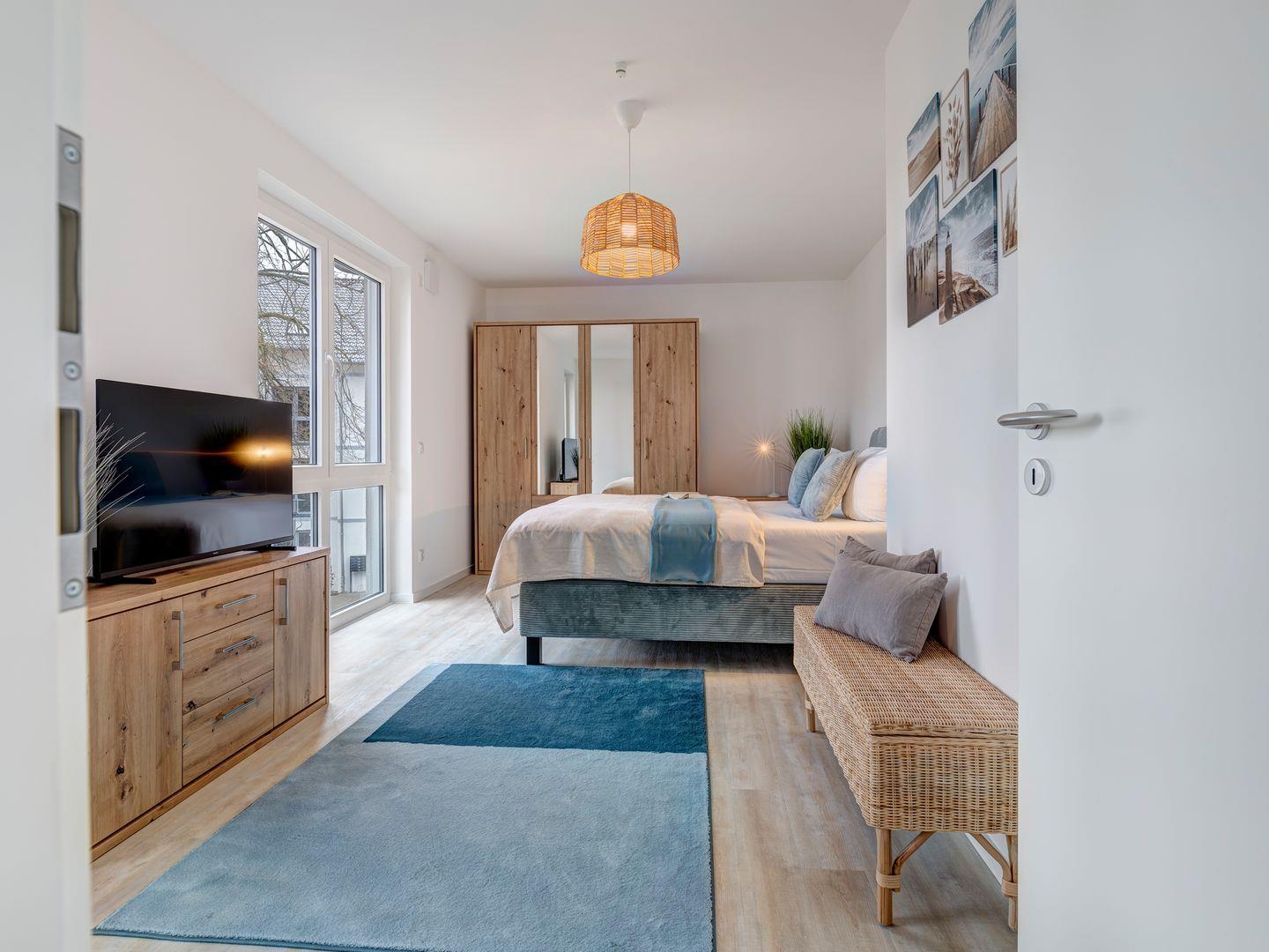 Das komfortable Schlafzimmer bietet mit eigenem Fernseher einen gemütlichen Platz für erholsame Nächte. Der Wohnbereich mit integrierter Küche lädt zum Verweilen und Genießen ein, während der Balkon perfekt für entspannte Momente unter freiem Himmel ist.