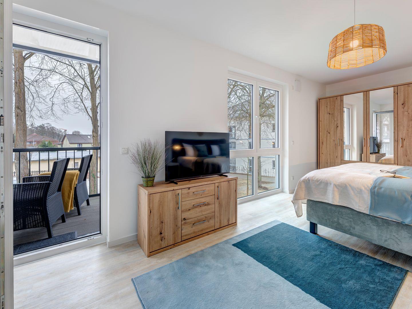 Das Schlafzimmer mit eigenem Fernseher bietet einen gemütlichen Platz für erholsame Nächte. Der Wohnbereich mit integrierter Küche lädt zum Verweilen ein, und der Balkon ist ideal für entspannte Momente im Freien.