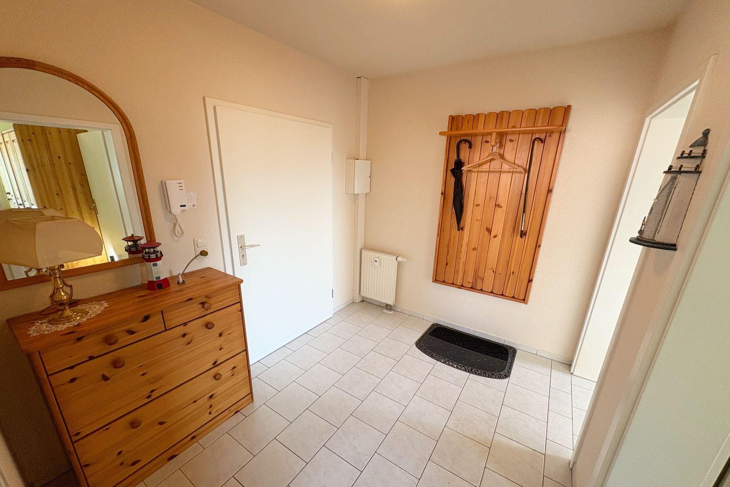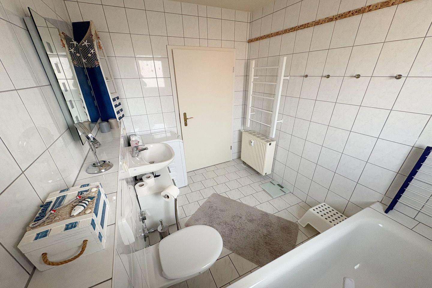 Die Ferienwohnung umfasst ein gemütliches Schlafzimmer mit einem komfortablen Bett und ausreichend Stauraum für Ihr Gepäck. Das Badezimmer besticht mit einer Badewanne und modernen Annehmlichkeiten wie einem Haartrockner und Kosmetikspiegel – hier können Sie sich nach einem langen Tag verwöhnen lassen. Für einen sorgenfreien Aufenthalt sind Bettwäsche und Handtücher bereits im Preis enthalten, ebenso wie die Erstausstattung an Haushaltsutensilien. Für Ihre Fahrräder steht ein abgeschlossener Kellerraum zur Verfügung.