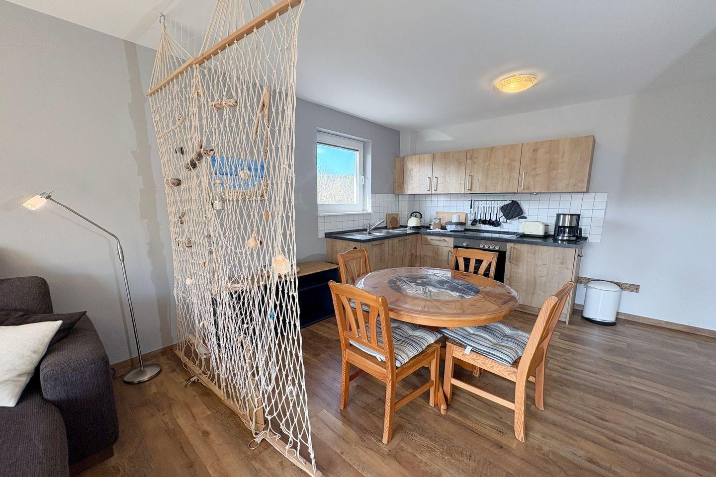 Die Wohnung bietet auf 52 m² ausreichend Platz für bis zu zwei Personen und ist perfekt für Paare oder Alleinreisende, die sich nach Ruhe und Erholung sehnen. Das geschmackvoll eingerichtete Wohnzimmer ist der ideale Ort, um nach einem ereignisreichen Tag zu entspannen. Hier finden Sie eine komfortable Sofaecke, einen Esstisch und moderne Unterhaltungsmöglichkeiten wie einen digitalen TV-Anschluss sowie ein Radio mit CD-Player. Zudem sorgt das WLAN für eine nahtlose Verbindung zu Ihren Lieben zu Hause.