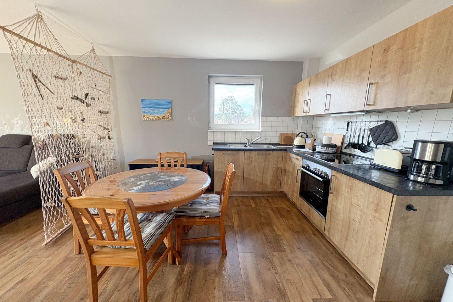 Die offene Küche ist komplett ausgestattet und lässt keine Wünsche offen. Sie verfügt über einen Cerankochfeld, einen Backofen, einen Kühlschrank, eine Spülmaschine sowie Kaffeemaschine und Toaster – alles, was Sie brauchen, um Ihre kulinarischen Fähigkeiten zu entfalten und Ihre Mahlzeiten in vollen Zügen zu genießen. Genießen Sie Ihre selbst zubereiteten Spezialitäten auf dem privaten Balkon, der mit Gartenmöbeln und Sonnenschirm ausgestattet ist.