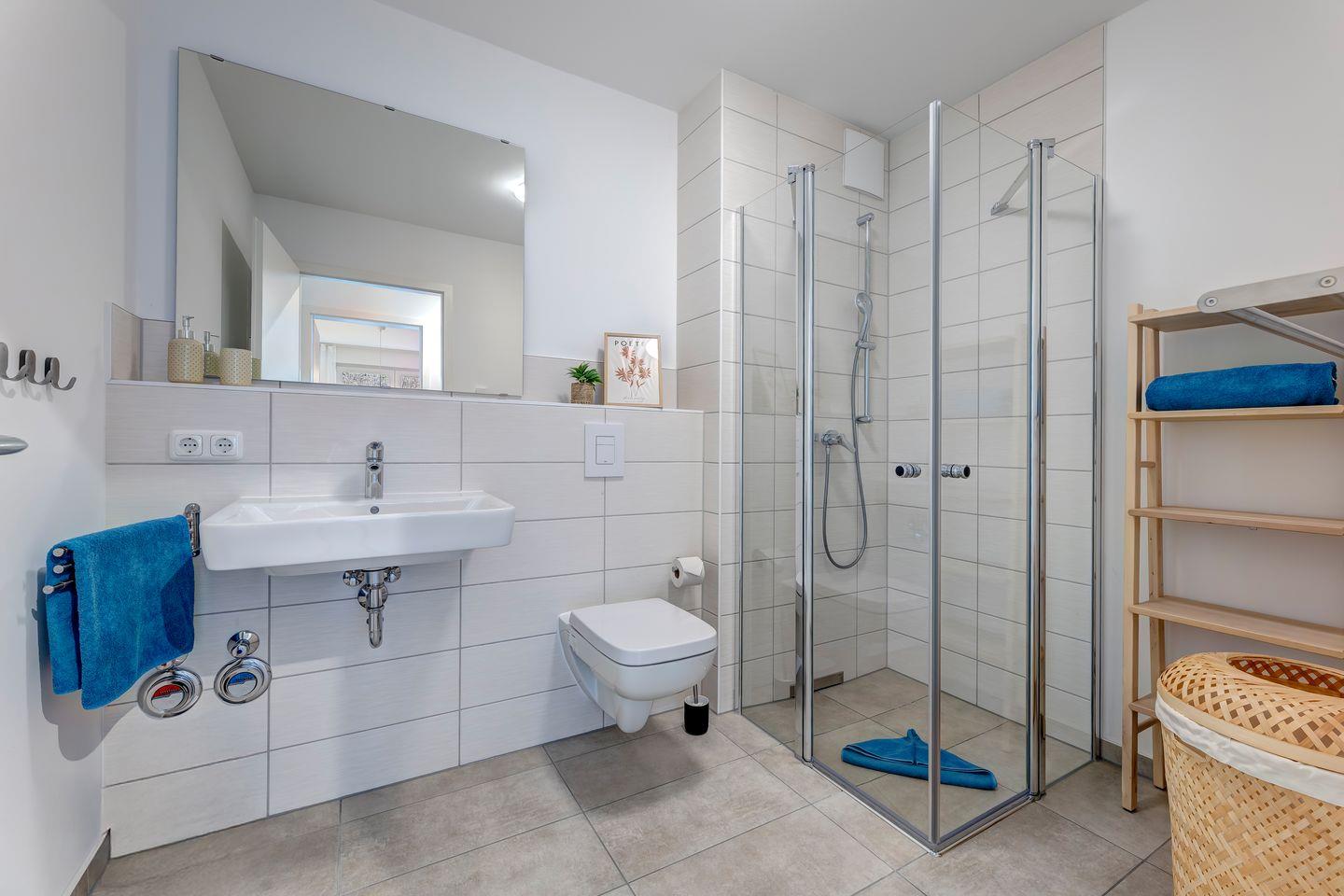 Zwei moderne Badezimmer, jeweils mit Dusche, Waschbecken und WC, sorgen für ausreichend Komfort und Privatsphäre.