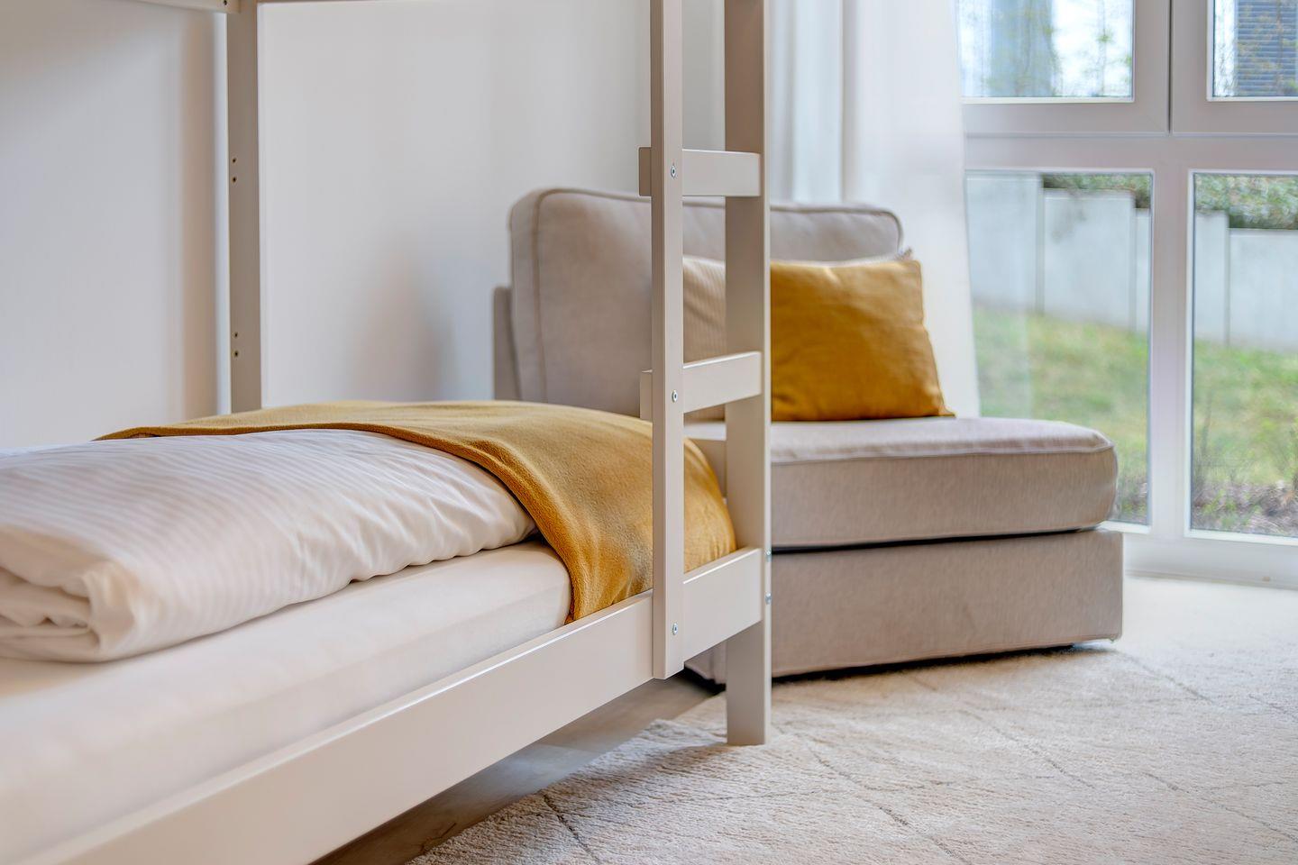Die Ferienwohnung verfügt über zwei separate Schlafzimmer: Ein Schlafzimmer ist mit einem gemütlichen Doppelbett ausgestattet, während das zweite Schlafzimmer über ein Etagenbett für maximal zwei Personen verfügt. Zusätzlich bieten ein bequemes Schlafsofa sowie ein Schlafsessel eine weitere Übernachtungsmöglichkeit für eine Person oder ein Kind.