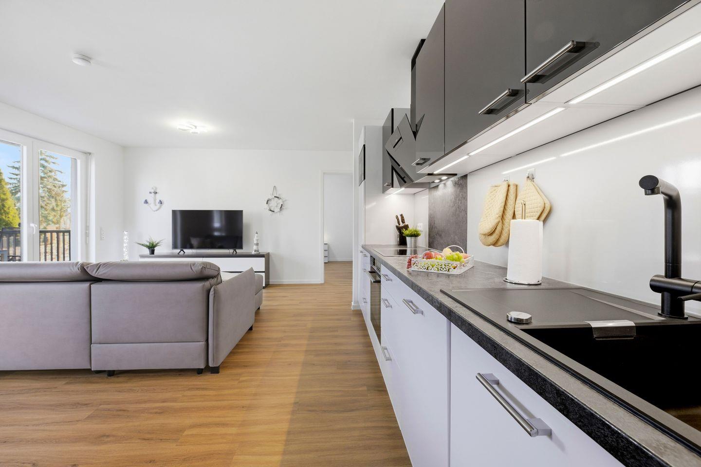 Der offen gestaltete Wohnbereich verbindet Wohnzimmer und Küche und schafft eine helle, einladende Atmosphäre. Vom Wohnraum aus gelangen Sie auf den überdachten Balkon, der bei jedem Wetter zum Entspannen einlädt. Die Wohnung ist modern und geschmackvoll eingerichtet und bietet hohen Wohnkomfort.