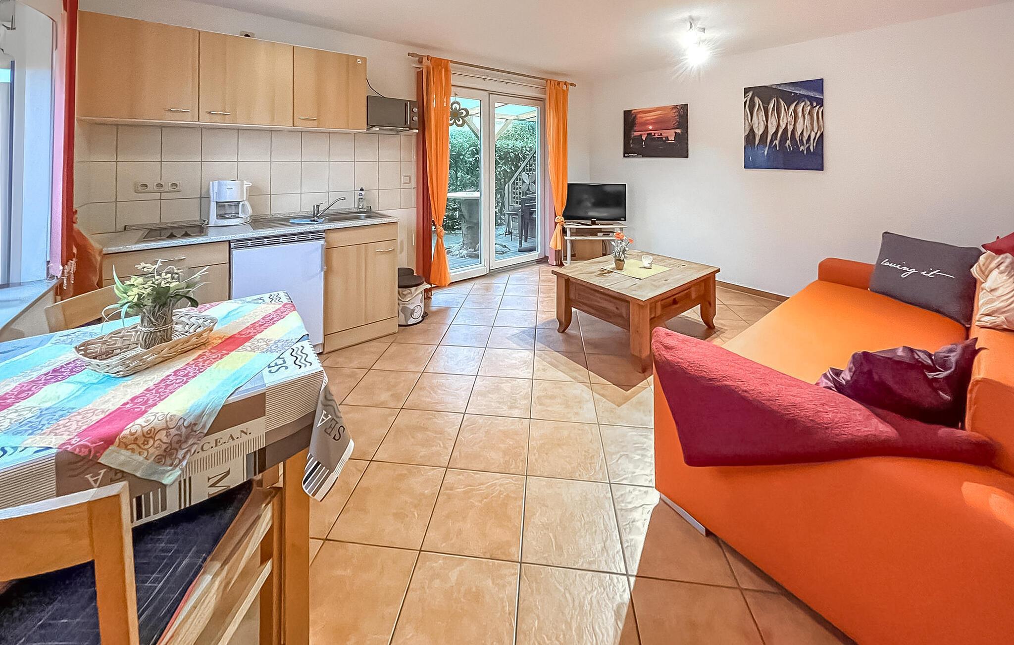 Diese eine von drei Ferienwohnungen befindet sich in einem separaten Ferienhaus im Reihenhausstil mit separatem Zugang. Ruhige Lage in einer Seitenstraße, ca. 500 m vom Strand entfernt. Die Wohnung verfügt über ein Wohnzimmer (Doppelschlafcouch, Essecke, TV, Radio), Schlafzimmer mit Doppelbett, Pantryküche mit 2-Plattenherd und Mikrowelle, Dusche/WC, Zentralheizung. Zur Wohnung gehört eine möblierte Terrasse mit Grill und ein kostenfreier Parkplatz. Nutzung einer Waschmaschine nach Absprache möglich. Im Gesamtpreis sind enthalten: Bettwäsche, Wasser- und Energieverbrauch. Sie müssen Ihre eigenen Handtücher mitbringen. Haustiere: Ein kleiner Hund (keine Katze) bis zu einer Größe von 40 cm ist in dieser Unterkunft gestattet. Bitte bringen Sie eine Matte/Schlafmöglichkeit (Decke, Korb) für Ihr Tier mit.
