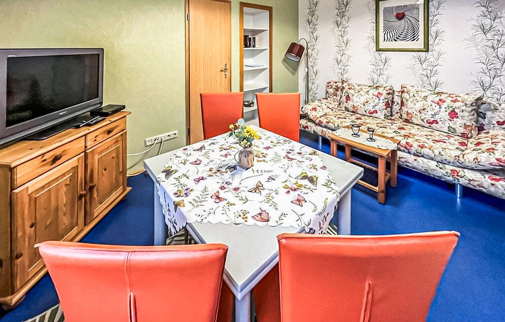 Die Zweizimmerwohnung liegt im Obergeschoss und verfügt über einen möblierten Balkon. Sie ist ausgestattet mit einem Wohnraum mit offener Küchenzeile (Polstermöbel mit Schlaffunktion, Flat-TV, Esstisch, Elektroherd, Kühlschrank mit Gefrierfach, diverse Küchengeräte), einem Schlafzimmer mit Doppelbett und einem Badezimmer mit Dusche/WC. Auf dem 820 qm großen Grundstück befindet sich ein zentraler Außensitzplatz mit Grillmöglichkeit. Außerdem gibt es eine Abstellmöglichkeit für Fahrräder und einen PKW-Stellplatz. Für Kleinkinder können ein Babybett und ein Hochstuhl bereitgestellt werden. Kostenloses WLAN ist ebenfalls vorhanden.
