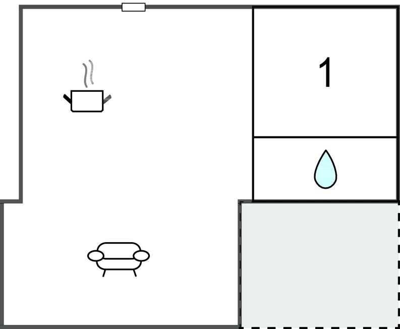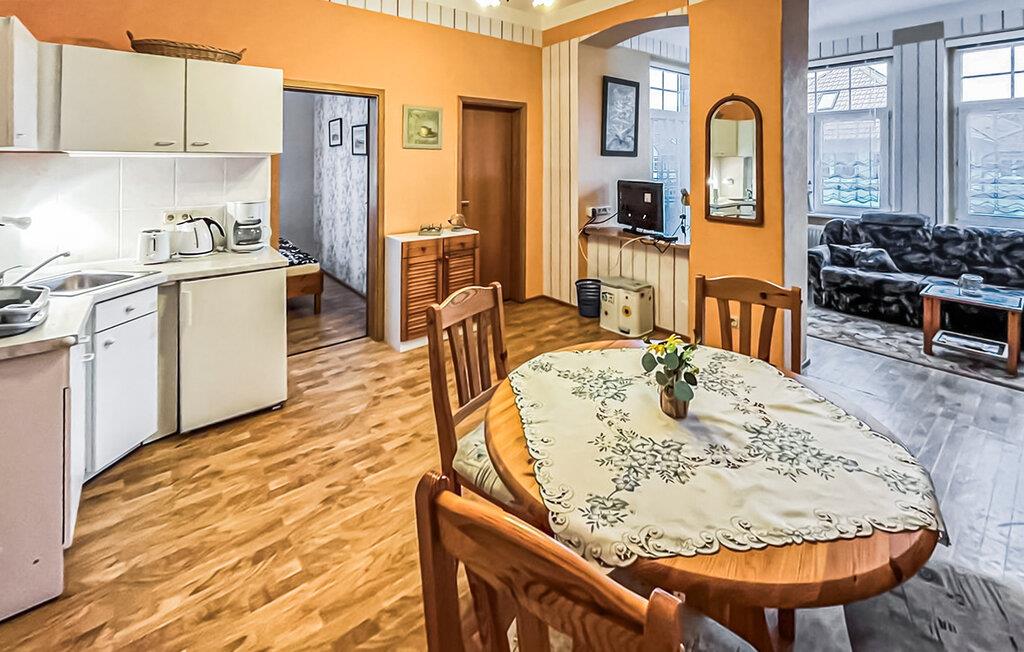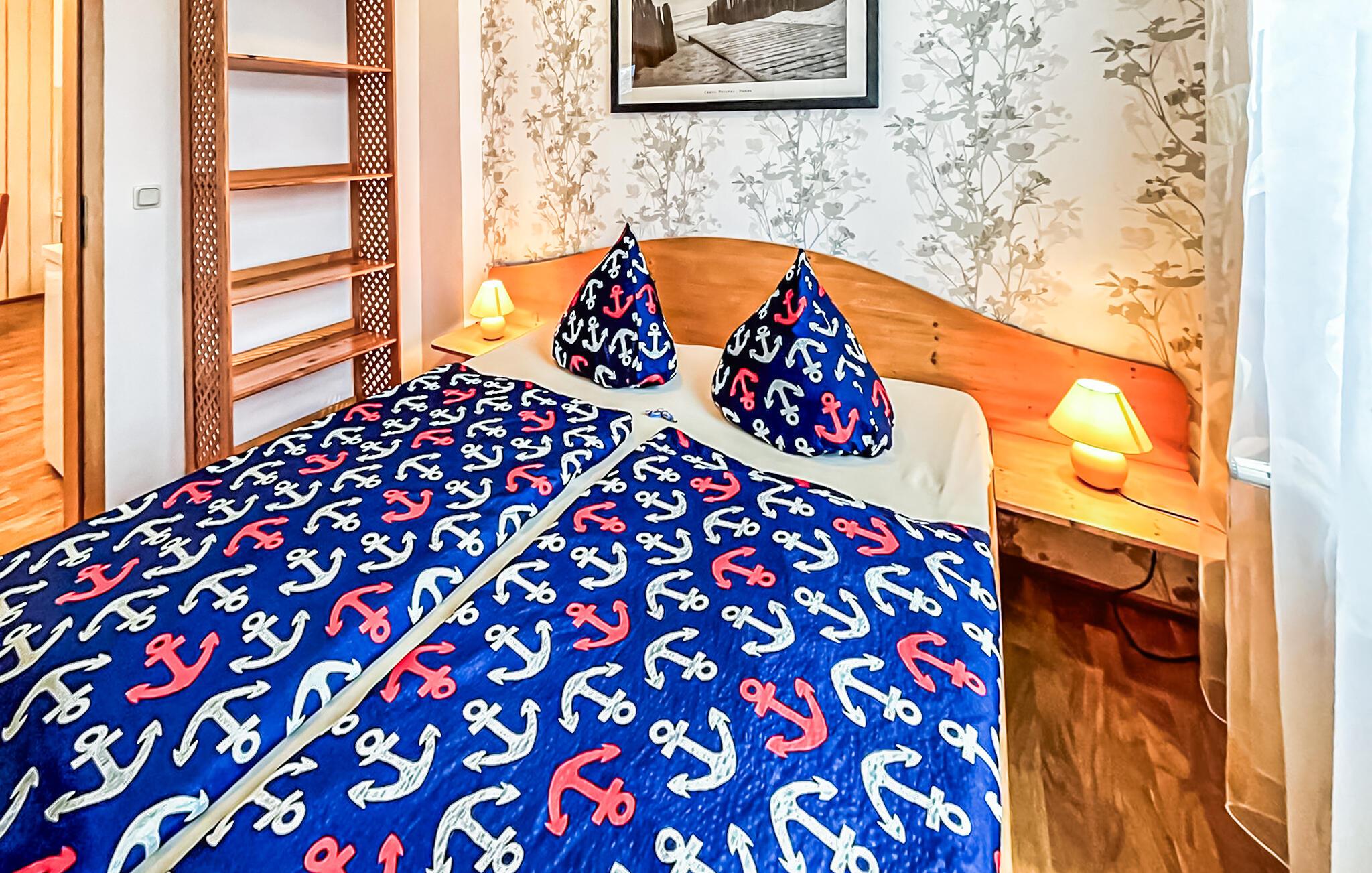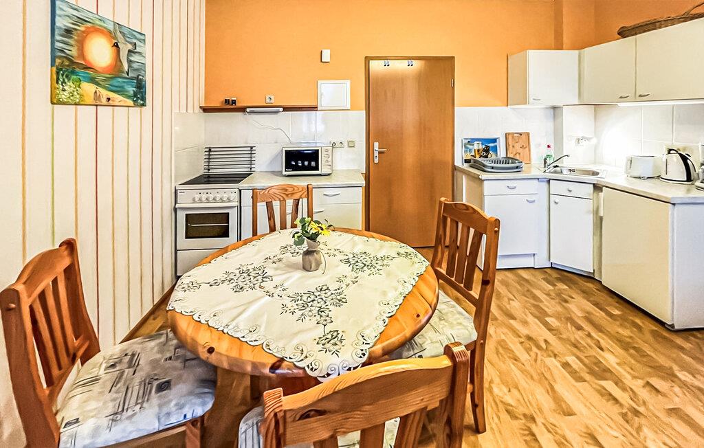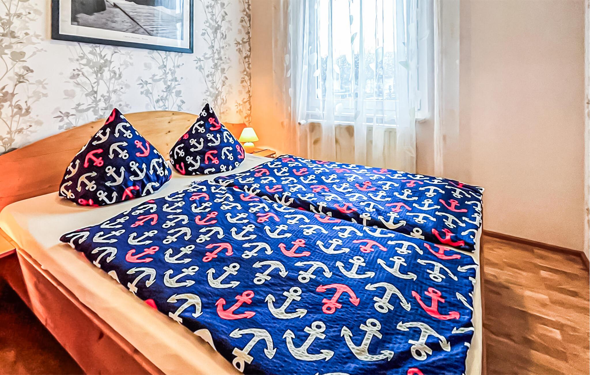 Die Zweiraum-Wohnung für 2 bis max. 4 Personen befindet sich im Obergeschoss und verfügt über einen möblierten Balkon. Sie ist ausgestattet mit einem Wohnbereich (Polstermöbel mit Schlaffunktion als Aufbettungsmöglichkeit für 2 Personen, Flachbild-TV), einer offenen Küchenzeile (Esstisch, E-Herd mit Backofen, Kühlschrank mit Tiefkühlteil, Mikrowelle, div. Küchengeräte), einem Schlafraum (Doppelbett) sowie einem Bad mit DU/WC.