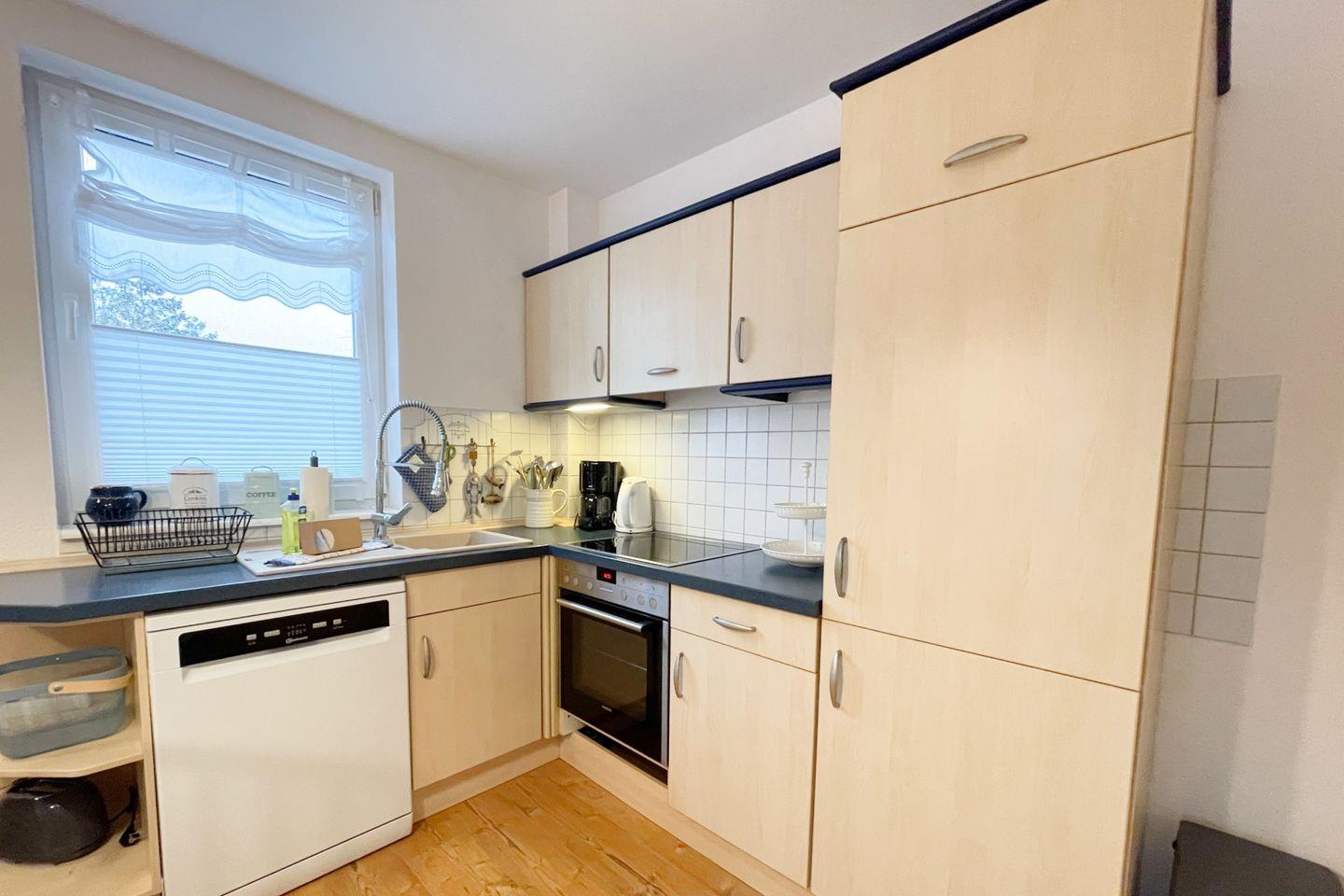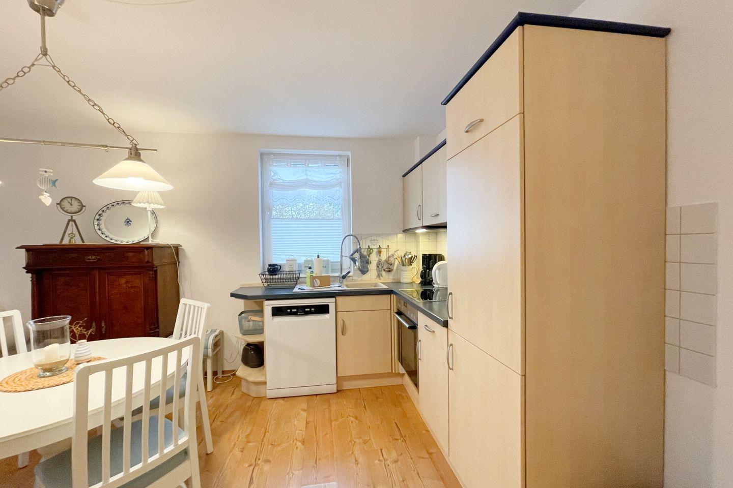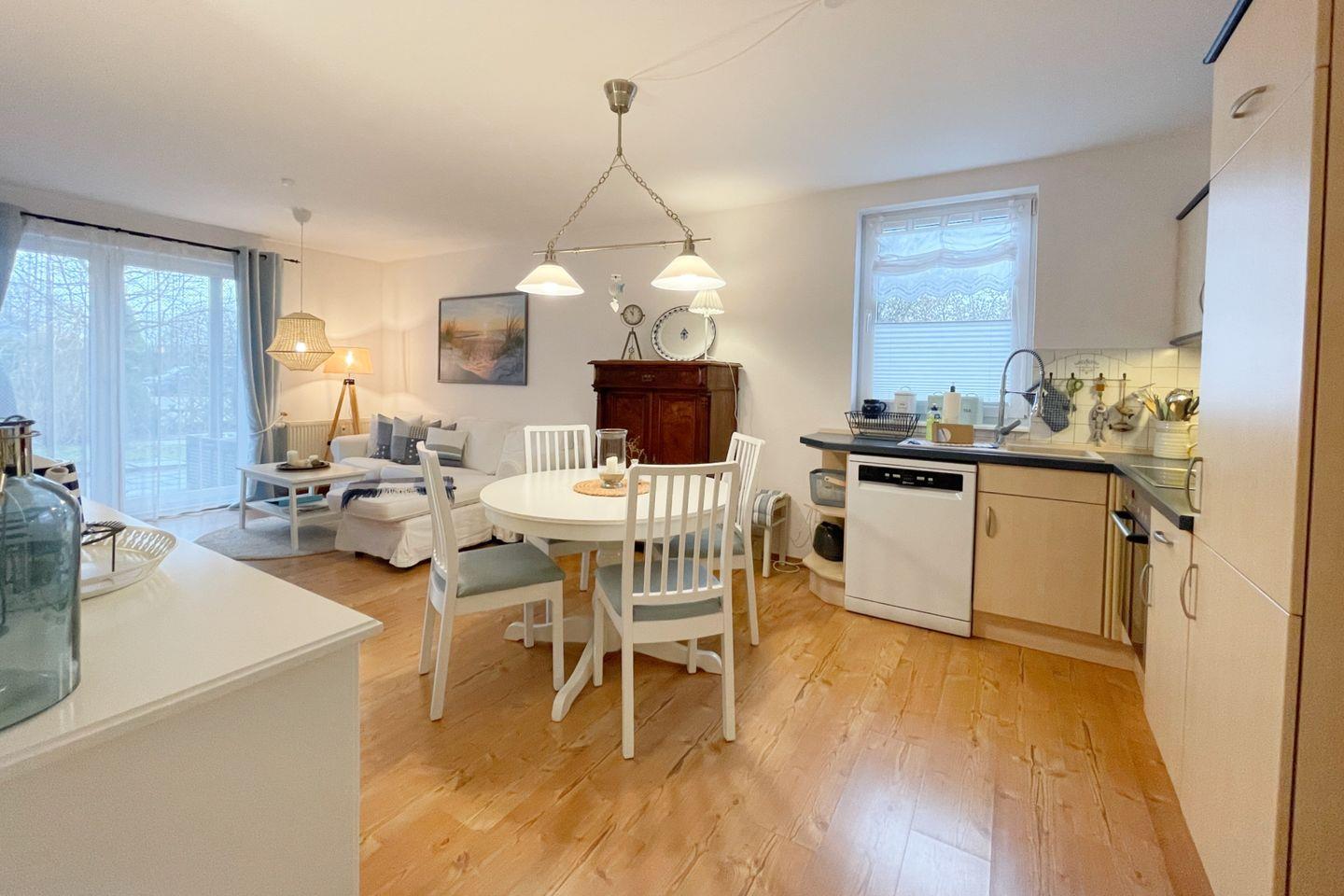 Die offene Küche ist komplett ausgestattet und lässt keine Wünsche offen. Sie finden hier ein modernes Cerankochfeld, einen Elektrobackofen, eine Spülmaschine, einen Kühlschrank mit Gefrierfach und zahlreiche Küchenutensilien. Bereiten Sie sich Ihre Lieblingsgerichte zu und genießen Sie diese am Esstisch oder auf der eigenen Terrasse, die mit gemütlichen Gartenmöbeln ausgestattet ist und Ihnen einen Blick in den Garten bietet – eine ideale Kulisse für ein Frühstück im Freien oder ein romantisches Abendessen.