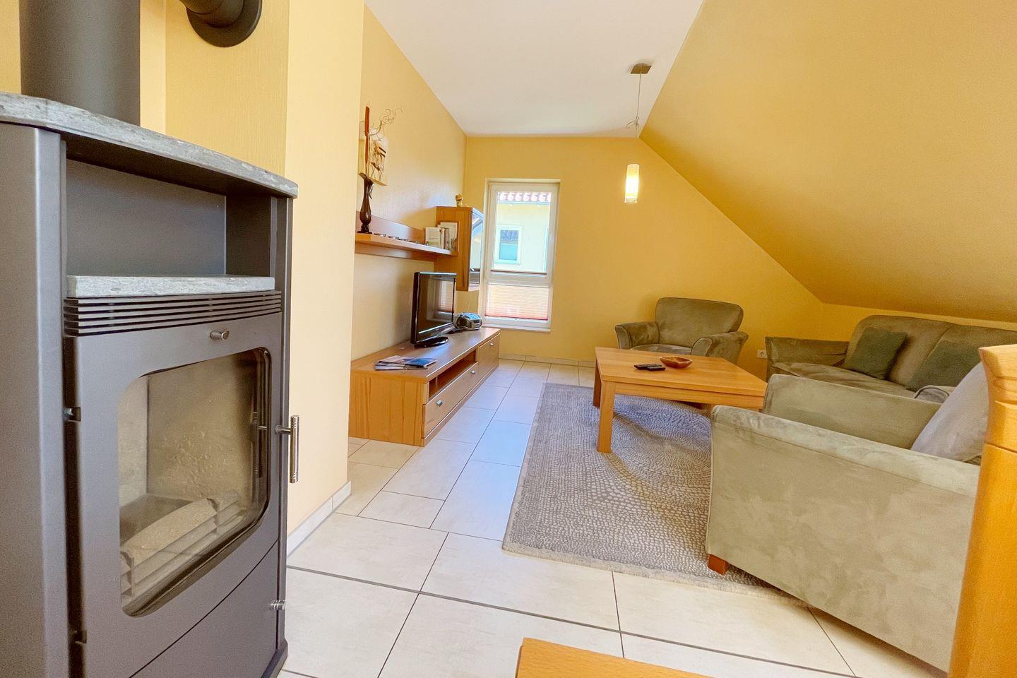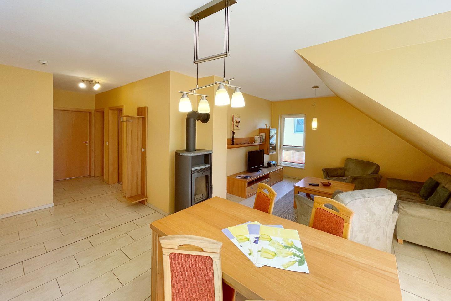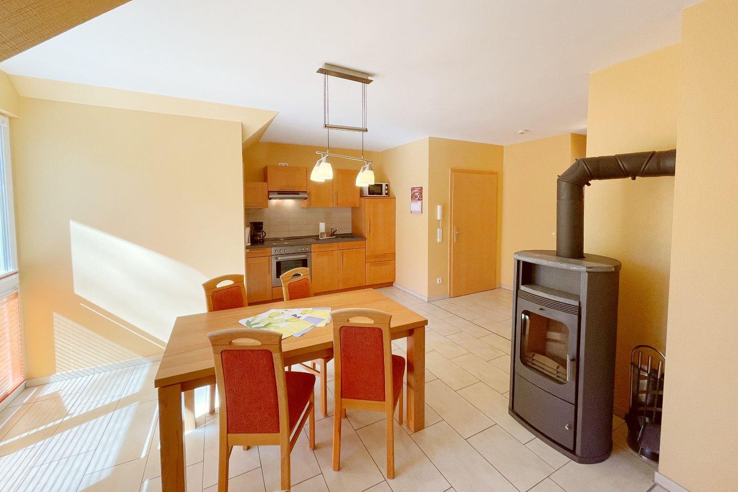 In der Ferienwohnung dürfen Sie sich auf zwei behagliche Schlafzimmer freuen, die mit hochwertigen Matratzen und stilvollen Möbeln ausgestattet sind. Das Badezimmer ist mit einer Dusche ausgestattet, sodass Sie nach einem erlebnisreichen Tag in der Ostsee bequem entspannen können. Der offene Wohnbereich mit einer gemütlichen Sofaecke und einem Esstisch lädt zum Verweilen und gemeinsamen Spielen ein. Hier können Sie den Abend nach einem aufregenden Tag bei einem Film auf dem digitalen TV oder am Kaminofen ausklingen lassen.