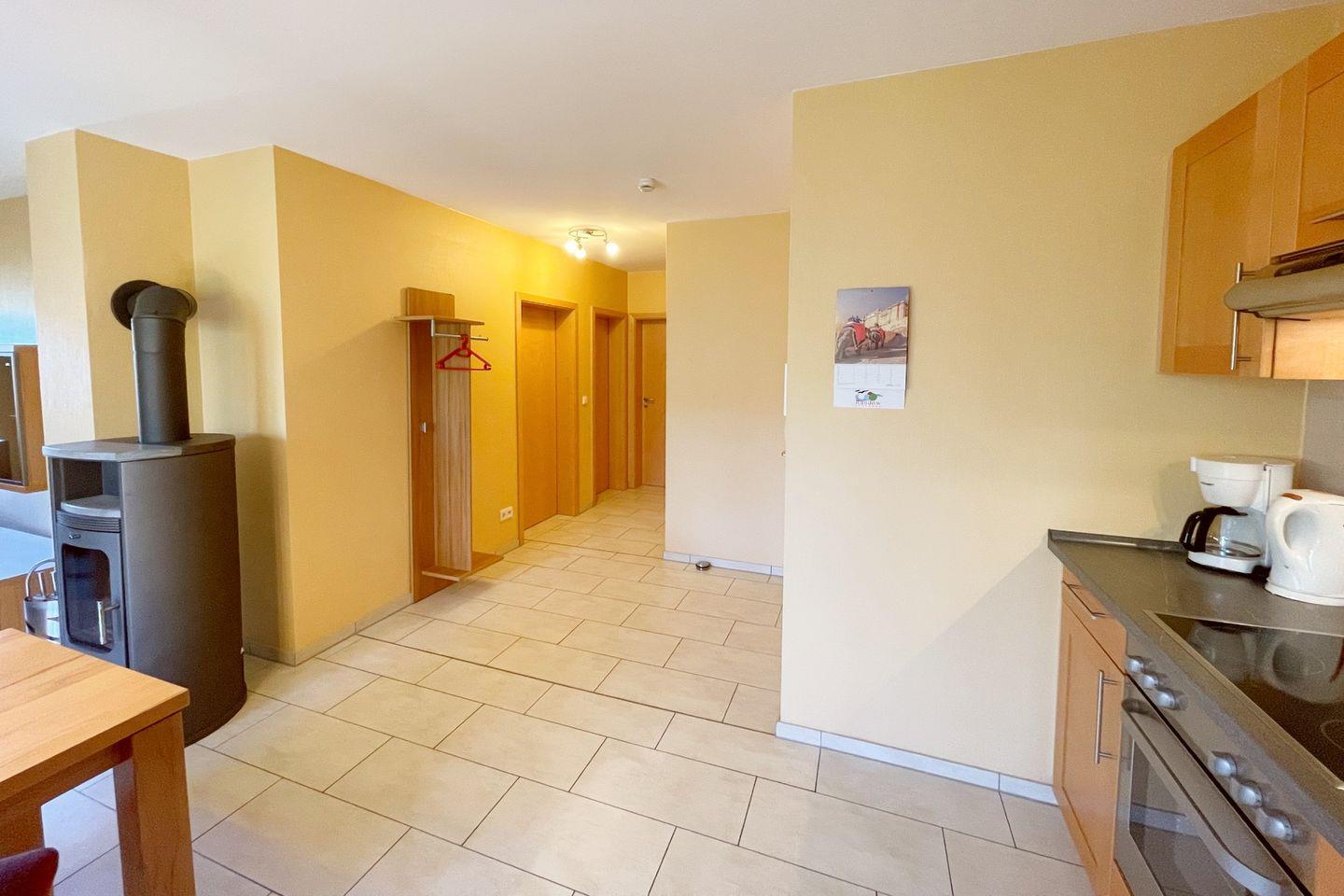 Die Wohnung erstreckt sich über drei lichtdurchflutete Zimmer, darunter zwei gemütliche Schlafzimmer, die durch ihre geschmackvolle Einrichtung und liebevollen Details bestechen. Ein solidarisches Wohngefühl entsteht im offenen Wohn- und Essbereich, der mit einer komfortablen Sitzecke, einem Esstisch und einem Kaminofen ausgestattet ist. Hier können Sie entspannte Abende verbringen und den Blick auf die wunderschöne Umgebung genießen. Die moderne Küche ist mit allen Annehmlichkeiten ausgestattet, einschließlich Geschirrspüler, Mikrowelle, Backofen und Kaffeemaschine, sodass beim Kochen Ihrer Lieblingsgerichte keine Wünsche offen bleiben.