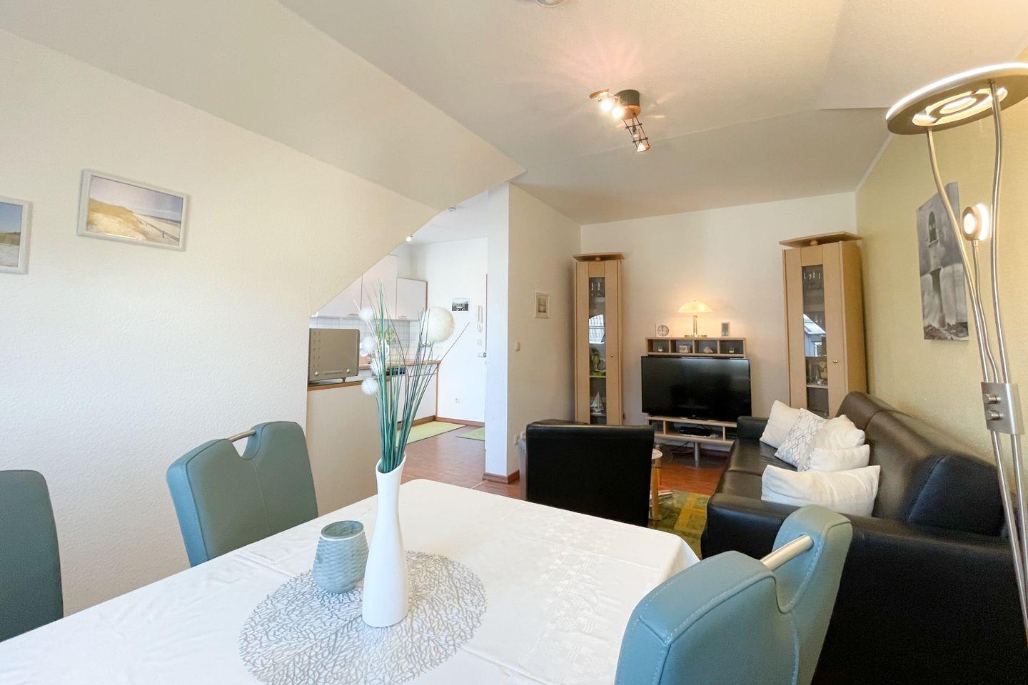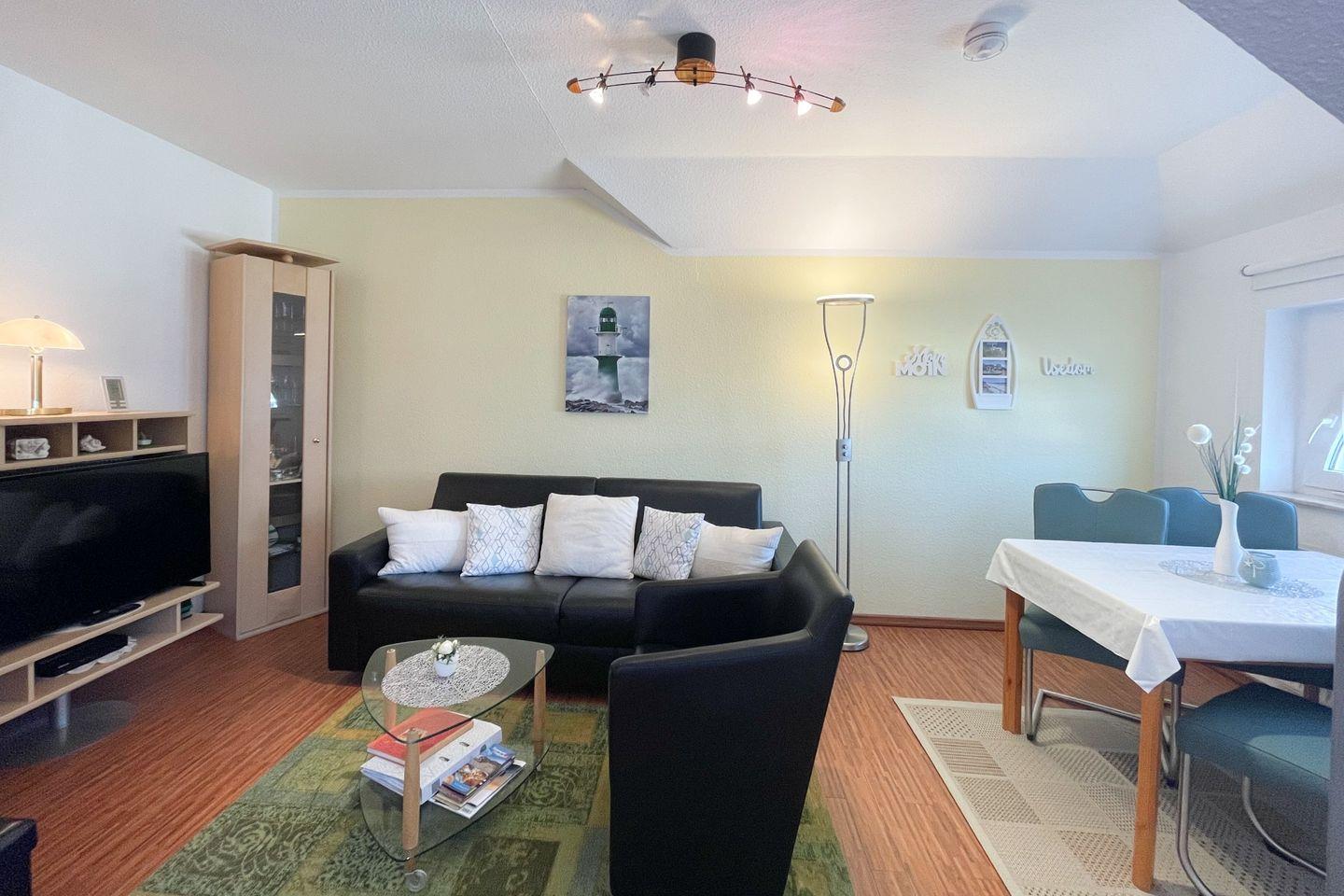 Die Ferienwohnung verfügt über ein gemütliches Schlafzimmer und ein zusätzlichen Schlafmöglichkeit auf dem Sofa im Wohnzimmer, von wo aus man in die moderne, offene Küche kommt. Dank der voll ausgestatteten Küche mit Ceranherd, Kühlschrank, Geschirrspüler, Mikrowelle und anderen notwendigen Küchenutensilien können Sie Ihre kulinarischen Fähigkeiten verwöhnen! Der Essbereich lädt zu geselligen Abendessen ein und bietet genügend Platz für alle. Um den Abend gemütlich ausklingen zu lassen, ist ein hochwertiger Fernseher vorhanden, an dem Sie Ihre Lieblingsfilme oder -Serien verfolgen können.