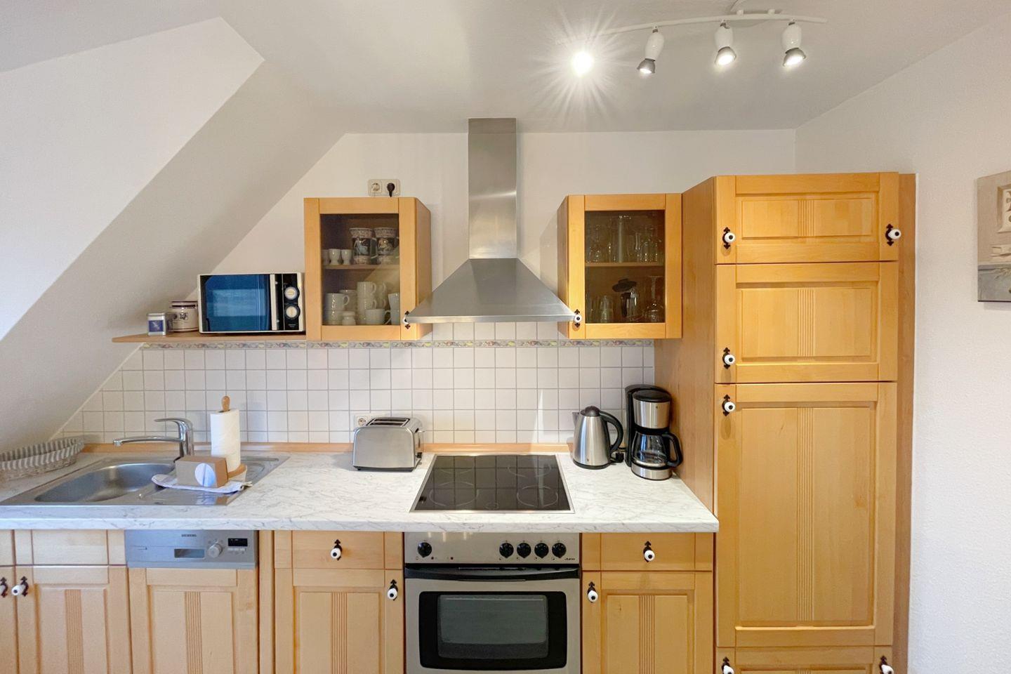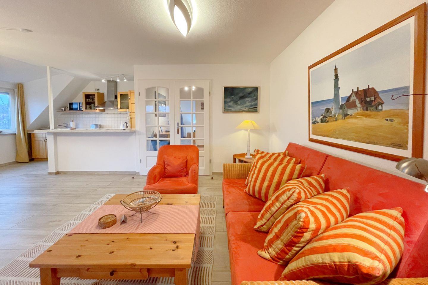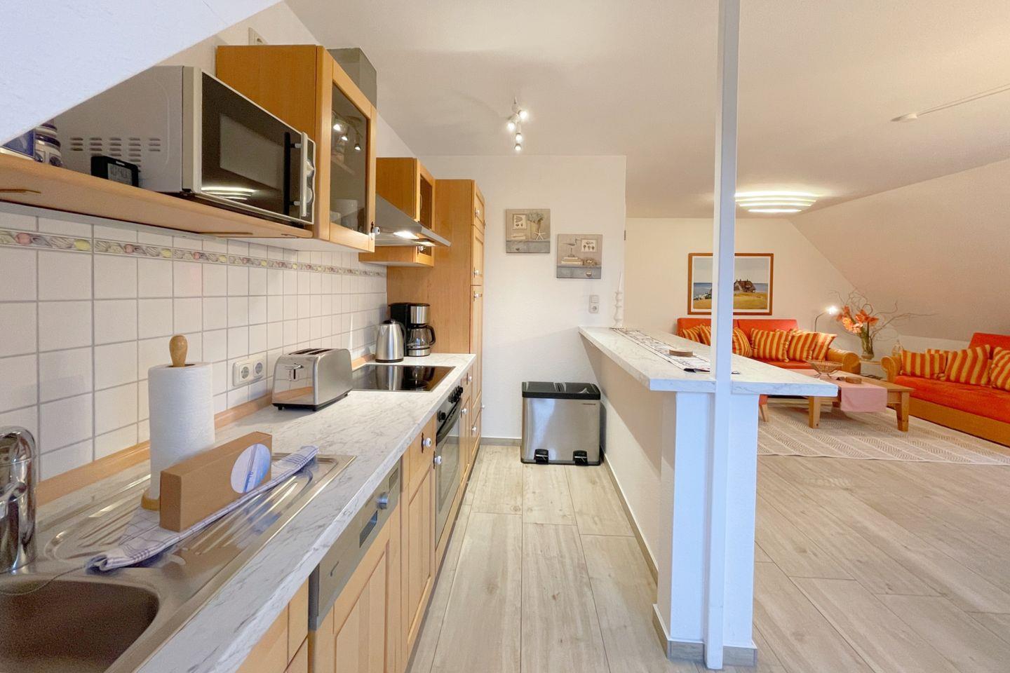 Die Ferienwohnung verfügt über ein einladendes Schlafzimmer, das Ruhe und Entspannung verspricht. Ein komfortabler Wohnbereich mit Sofaecke, einem Esstisch und einem Fernseher lädt dazu ein, gemeinsame Stunden zu verbringen, sei es beim Spielen, Fernsehen oder beim Genuss eines kleinen Frühstücks. Die offene Küche ist vollständig ausgestattet und lässt keine Wünsche offen – inklusive Spülmaschine, Kühlschrank, Cerankochfeld, Backofen und Mikrowelle. Hier können Sie Ihre kulinarischen Fähigkeiten entfalten und sich verwöhnen lassen!