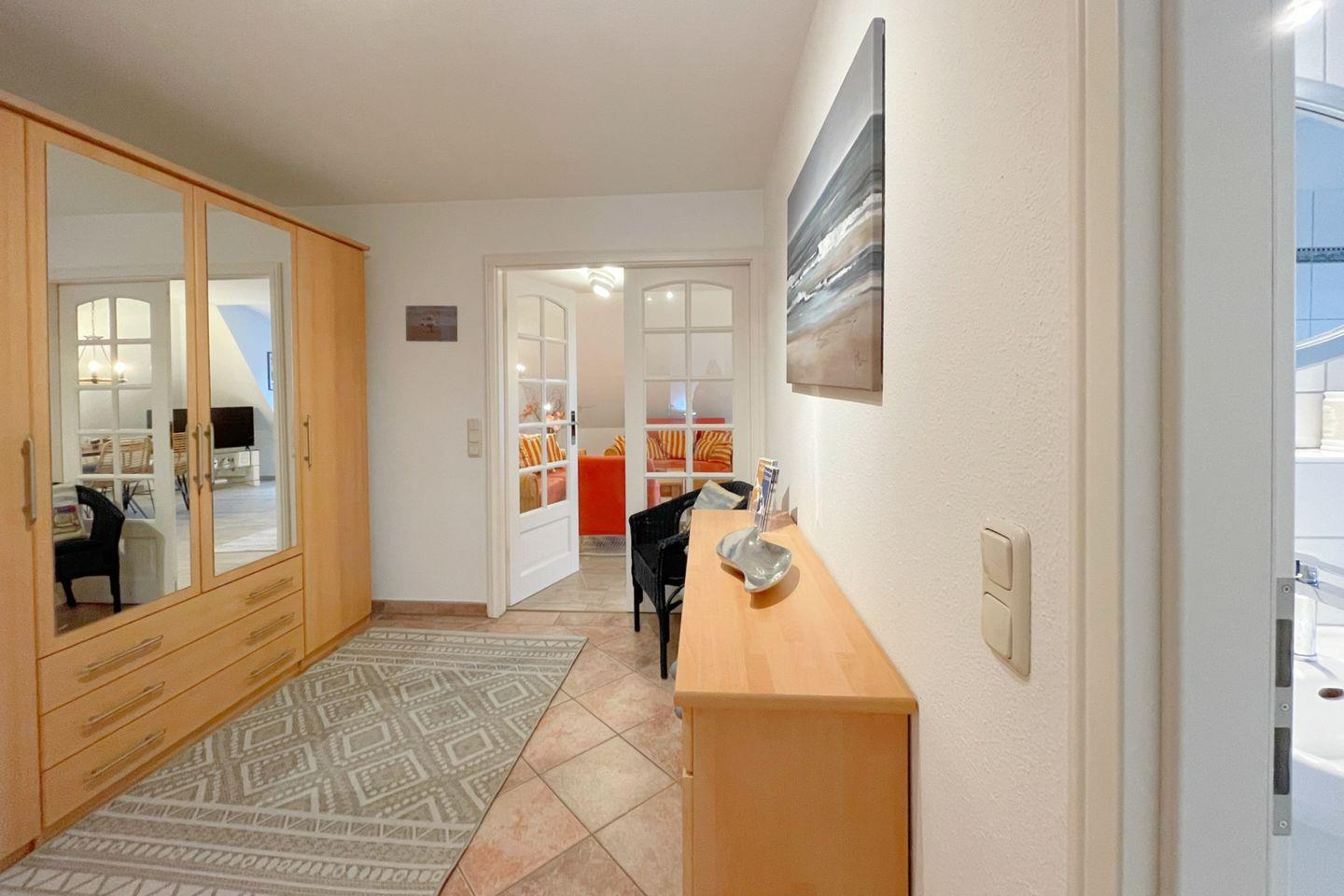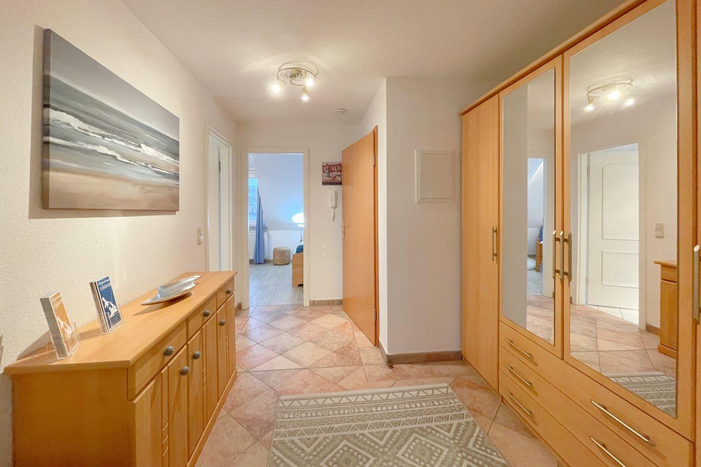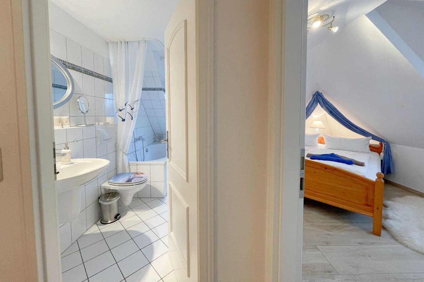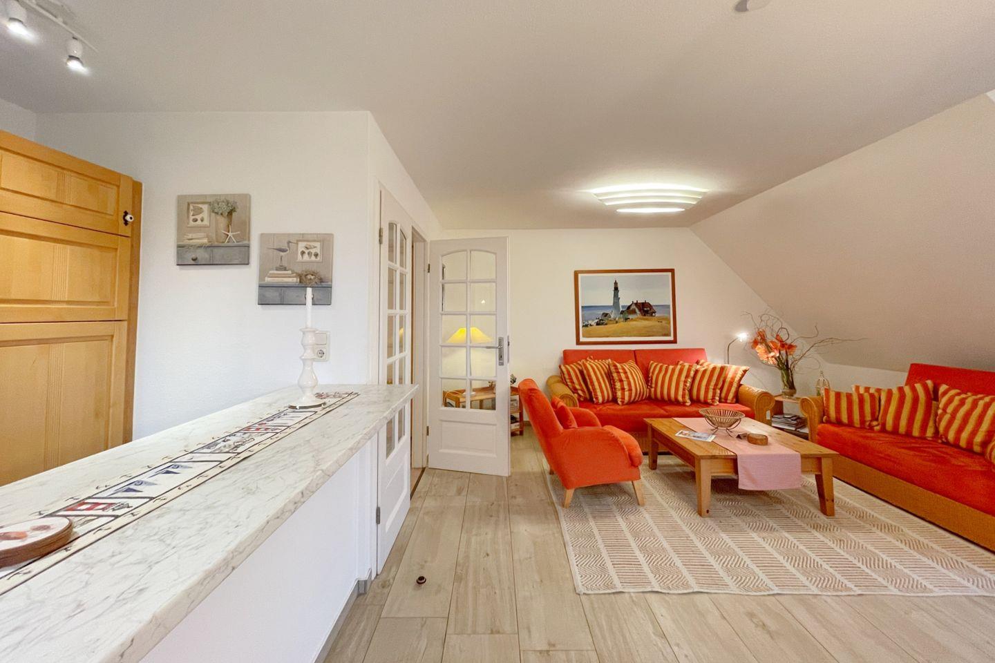 Die Ferienwohnung verfügt über ein einladendes Schlafzimmer, das Ruhe und Entspannung verspricht. Ein komfortabler Wohnbereich mit Sofaecke, einem Esstisch und einem Fernseher lädt dazu ein, gemeinsame Stunden zu verbringen, sei es beim Spielen, Fernsehen oder beim Genuss eines kleinen Frühstücks. Die offene Küche ist vollständig ausgestattet und lässt keine Wünsche offen – inklusive Spülmaschine, Kühlschrank, Cerankochfeld, Backofen und Mikrowelle. Hier können Sie Ihre kulinarischen Fähigkeiten entfalten und sich verwöhnen lassen!