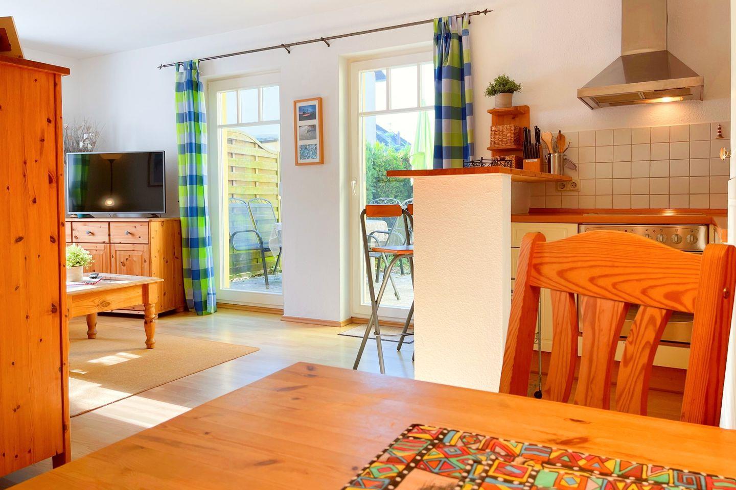 Das 3-Zimmer-Apartment im Erdgeschoss begrüßt Sie mit einer Sonnenterrasse in Südlage. Sehr ruhig und nur wenige Gehminuten von der Ostsee entfernt. Das Wohnzimmer mit offener Küche und Frühstücks Tresen für 2 Personen, Essbereich für 4 Personen und einer bequemen Couchecke, bildet das Herzstück dieses Apartments. Ein Schlafzimmer ist mit einem Doppelbett und Kleiderschrank, das andere ist mit einem Doppelstockbett, einem Einzelbett und Kleiderschrank ausgestattet. In dem modernen Duschbad befindet sich neben dem WC ein Waschbecken mit Spiegel.