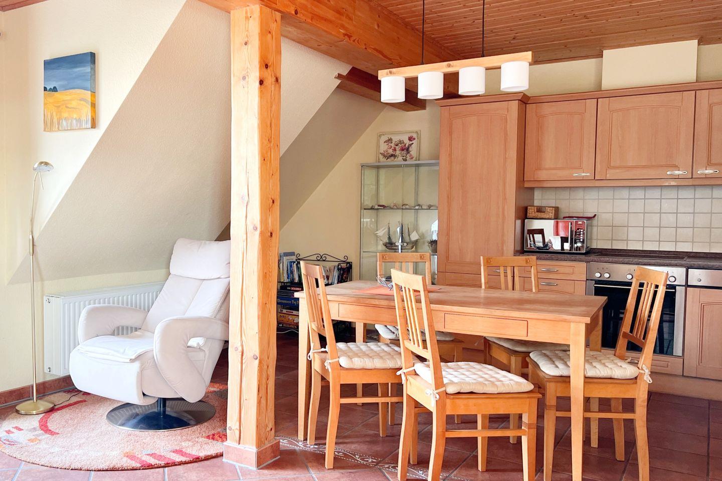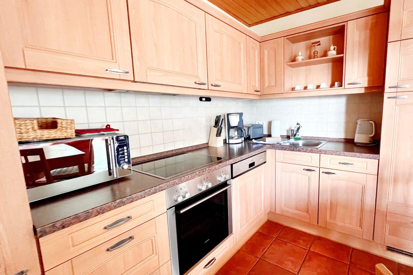 Die Wohnung besteht aus zwei geschmackvoll eingerichteten Schlafzimmern, die Ihnen erholsame Nächte garantieren. Das helle Wohnzimmer mit einer gemütlichen Sofaecke und einem Kaminofen lädt zum Verweilen ein und sorgt für eine angenehme Atmosphäre, besonders an kalten Abenden. Von hier aus gelangen Sie in die offene Küche, die mit modernen Geräten inklusive Cerankochfeld, Backofen, Spülmaschine und Kühlschrank ausgestattet ist. Sie können Ihre Lieblingsgerichte zubereiten und diese am Esstisch im Essbereich genießen.