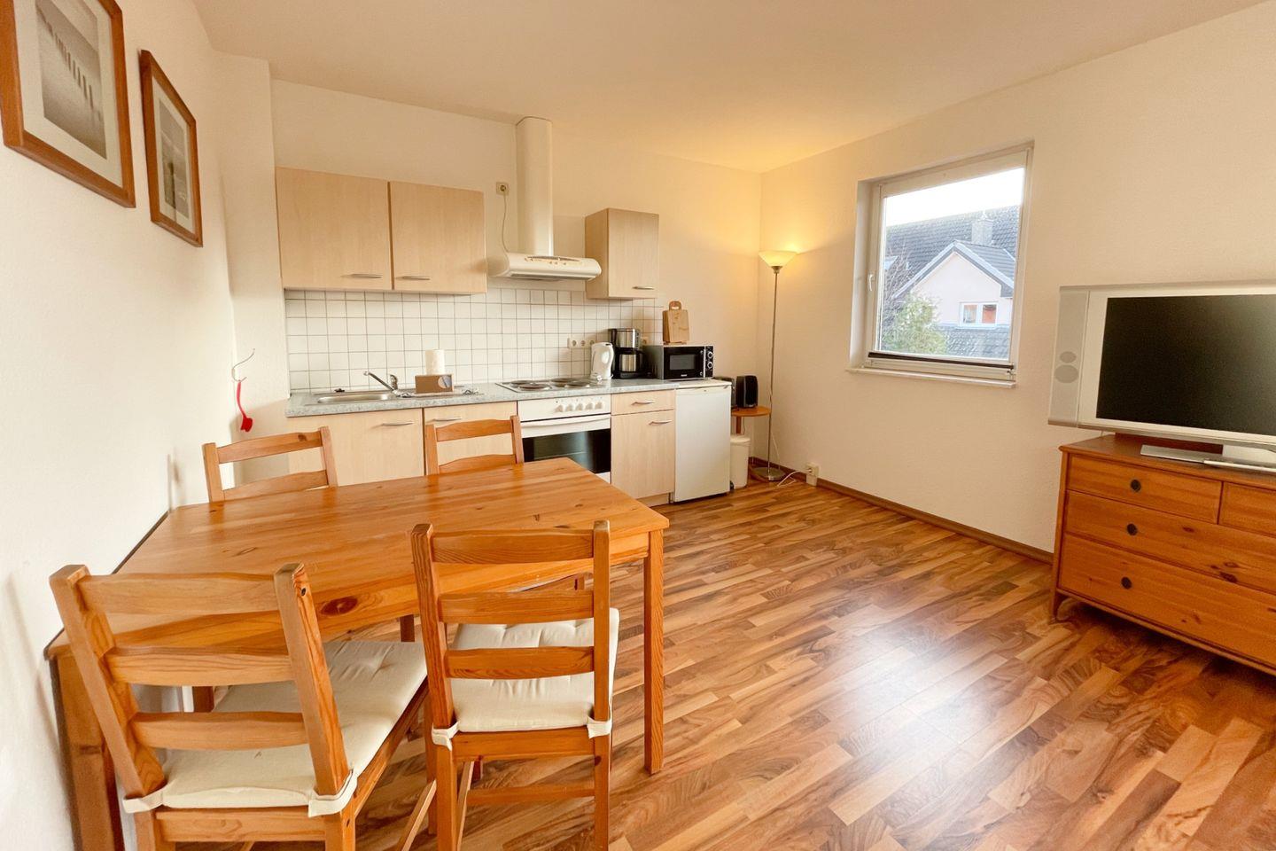 Die Wohnung verfügt über ein gemütliches und einladendes Wohnzimmer mit einer komfortablen Sofaecke und einer integrierten Schlafnische. Genießen Sie die offene Küche, die mit allen nötigen Annehmlichkeiten wie einem Herd, Backofen, Kühlschrank und Geschirrspüler ausgestattet ist. Hier können Sie leckere Mahlzeiten zubereiten und gemeinsam am Esstisch speisen.