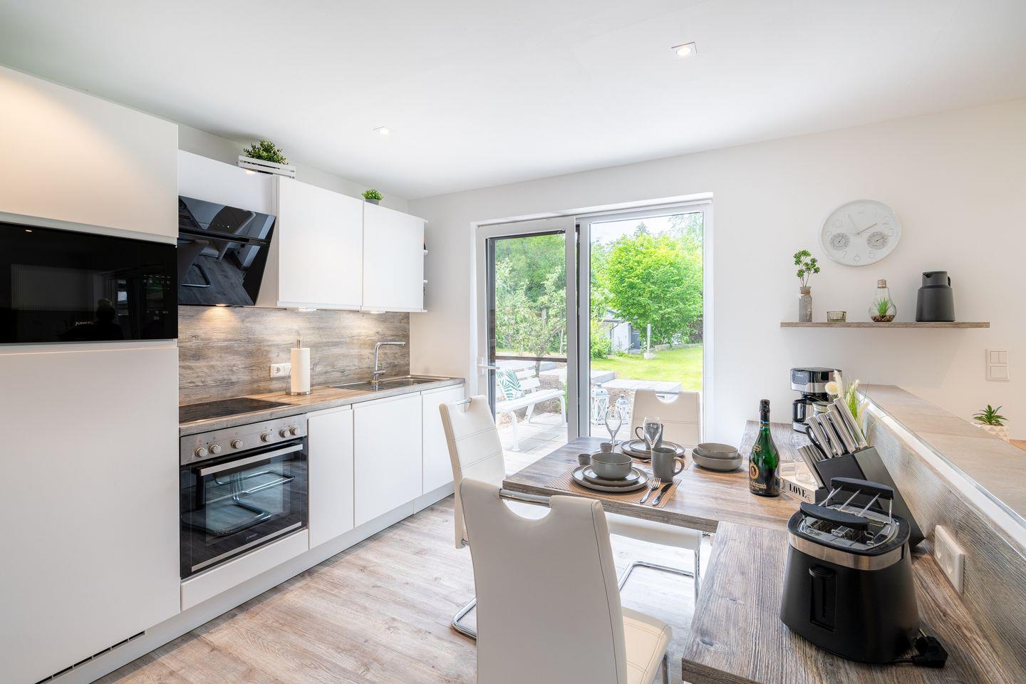 Ein besonderes Highlight ist die überdachte Terrasse, die mit Gartenmöbeln ausgestattet ist. Hier können Sie beim Frühstück die ersten Sonnenstrahlen oder bei einem Glas Wein den Abend ausklingen lassen. Der Blick ins Grüne sorgt dafür, dass Sie sich mitten in der Natur angekommen fühlen. Ein gepflegter Garten lädt die Kinder zum Spielen ein, sodass Sie auch bei einem Familienurlaub entspannen können.