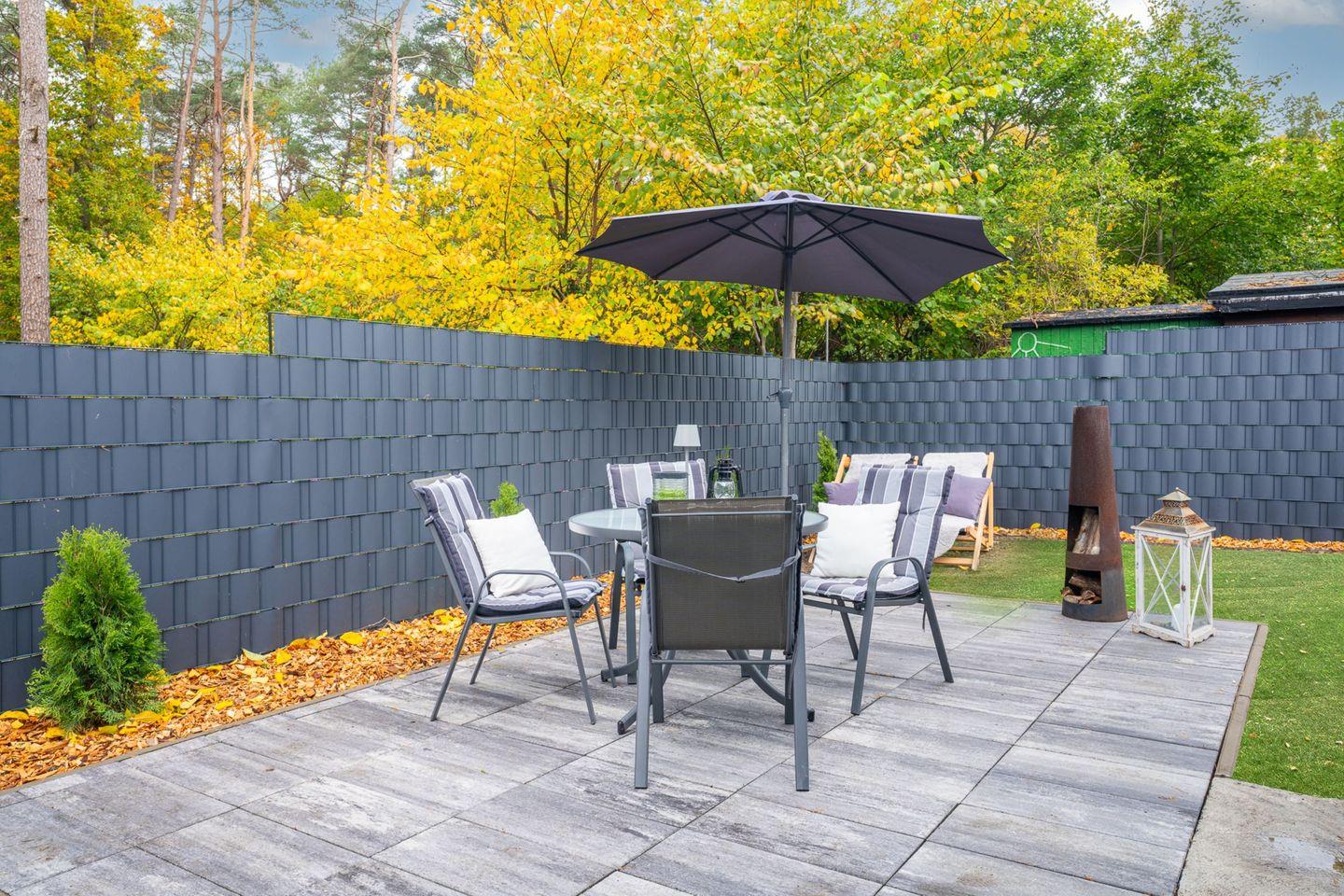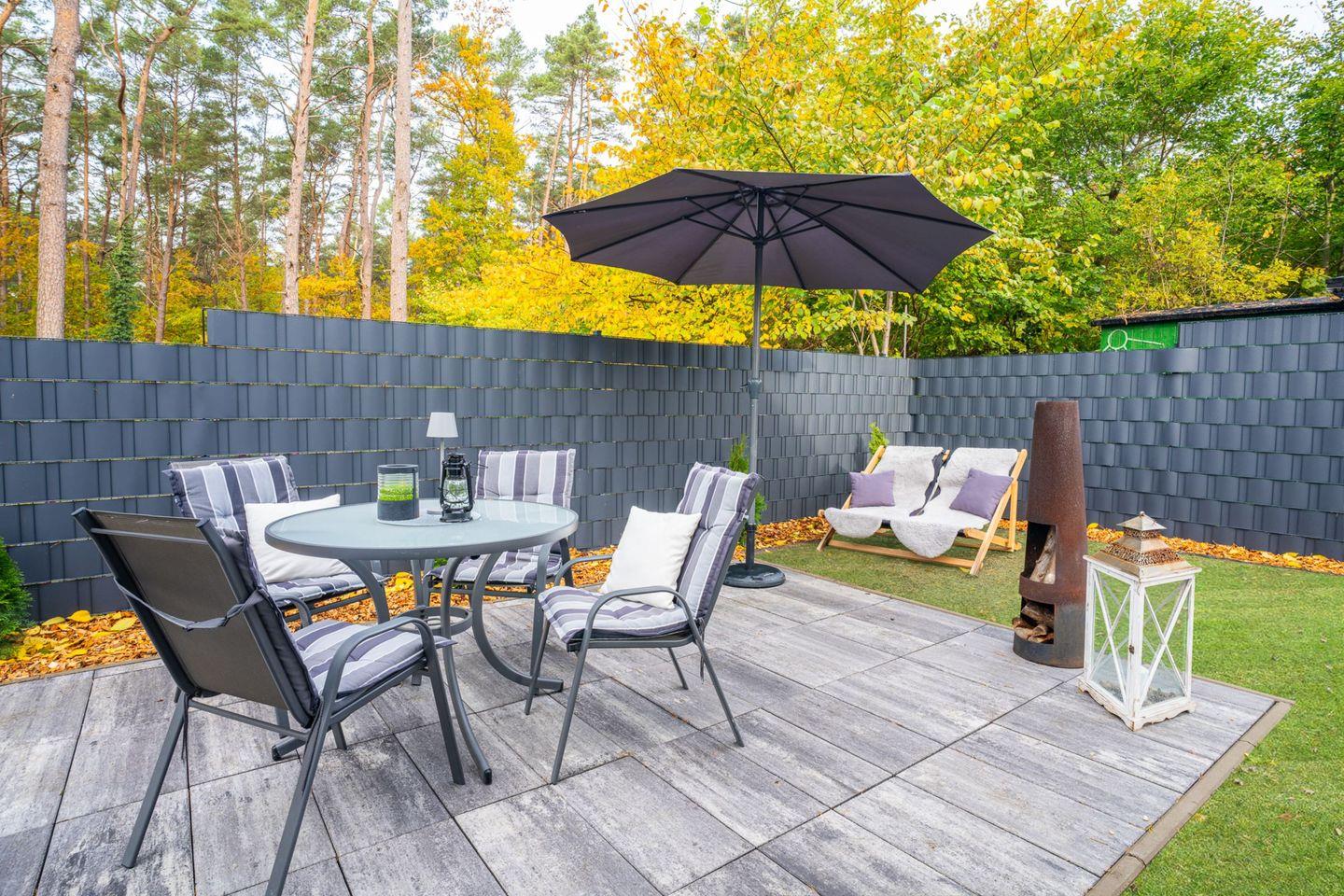 Das Außengelände präsentiert sich mit einer Terrasse sowie Gartenmöbeln, Sonnenliegen, Sonnenschirm und Grillplatz (Kohlegrill), ideal zum Entspannen, Grillen oder für ein Frühstück im Grünen. Eine gepflegte Liegewiese und ein Garten laden zum Verweilen ein. Erholungssuchende profitieren außerdem von einer privaten Sauna, die zur alleinigen Nutzung bereitsteht, sowie von weiteren Wellness-Extras wie Massagemöglichkeiten, Day Spa oder Kosmetikbehandlungen in der Region.