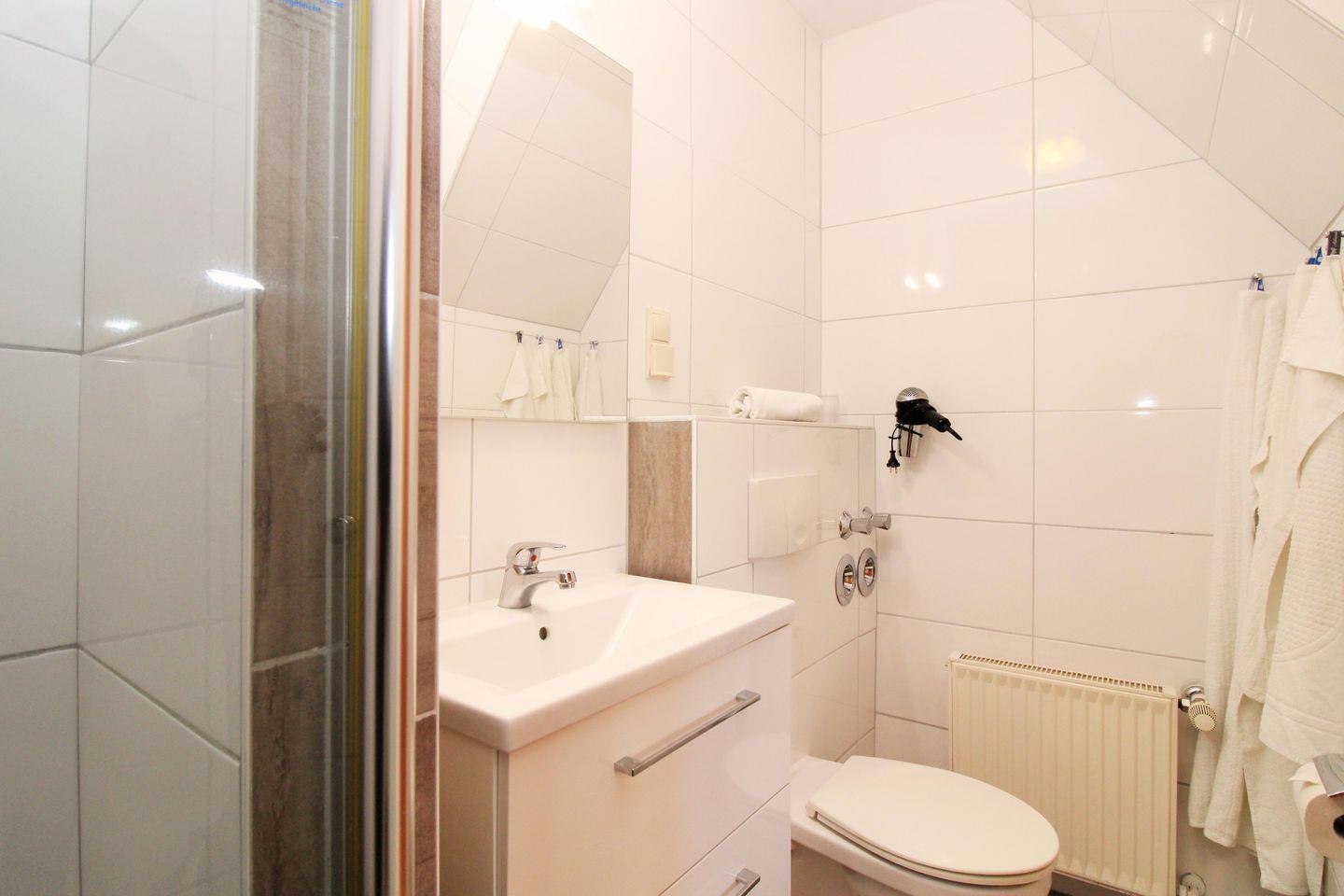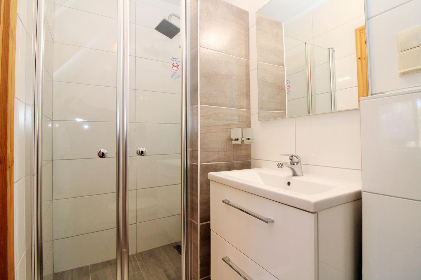 Das moderne Badezimmer verfügt über eine Dusche mit ebenerdigem Einstieg und Echtglas-Duschabtrennung, Waschbecken mit Unterschrank, Föhn sowie WC.