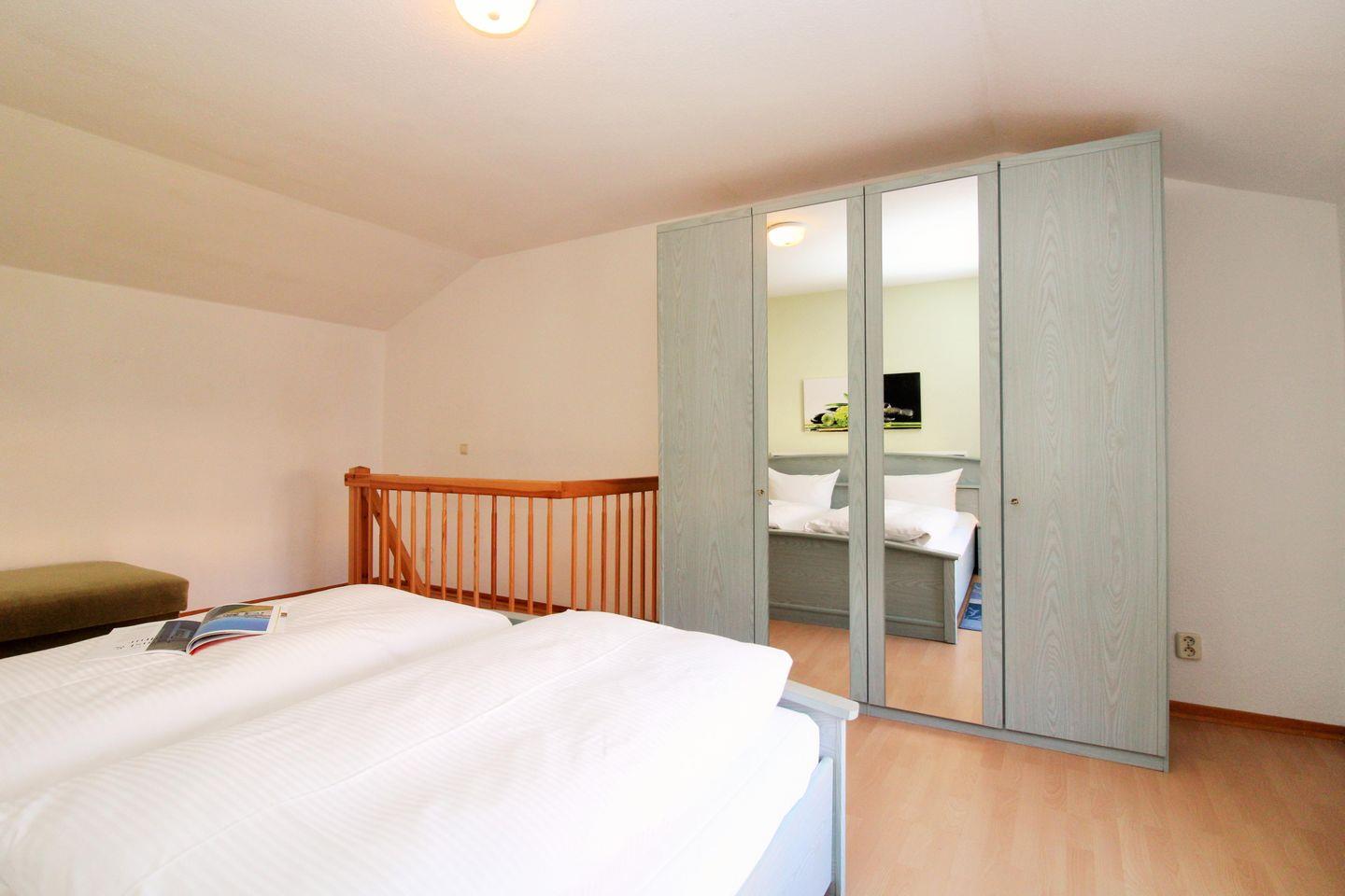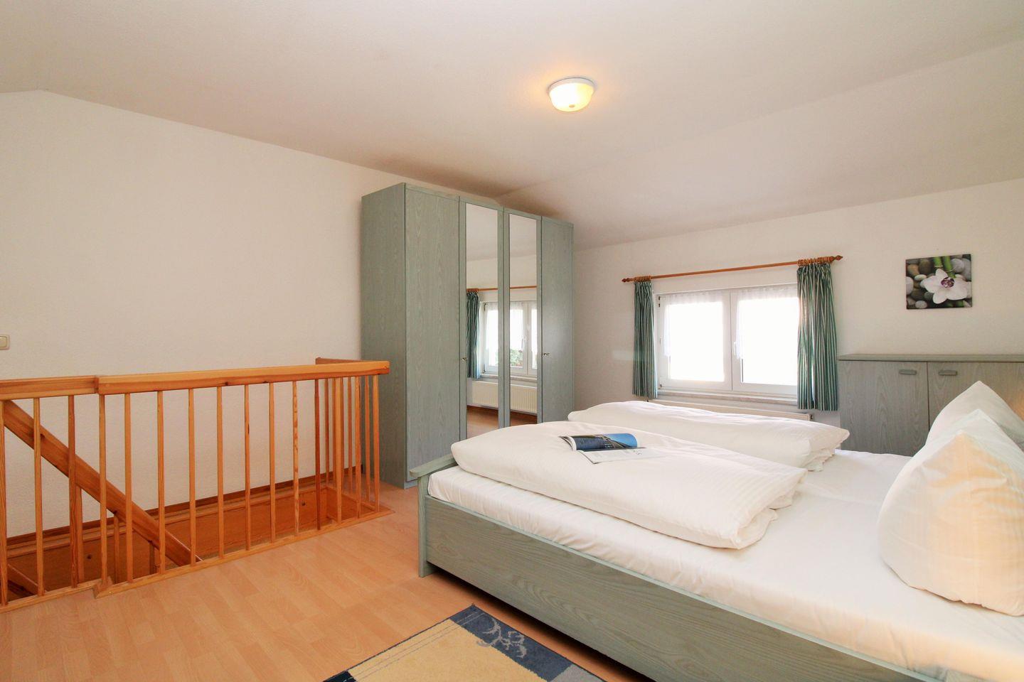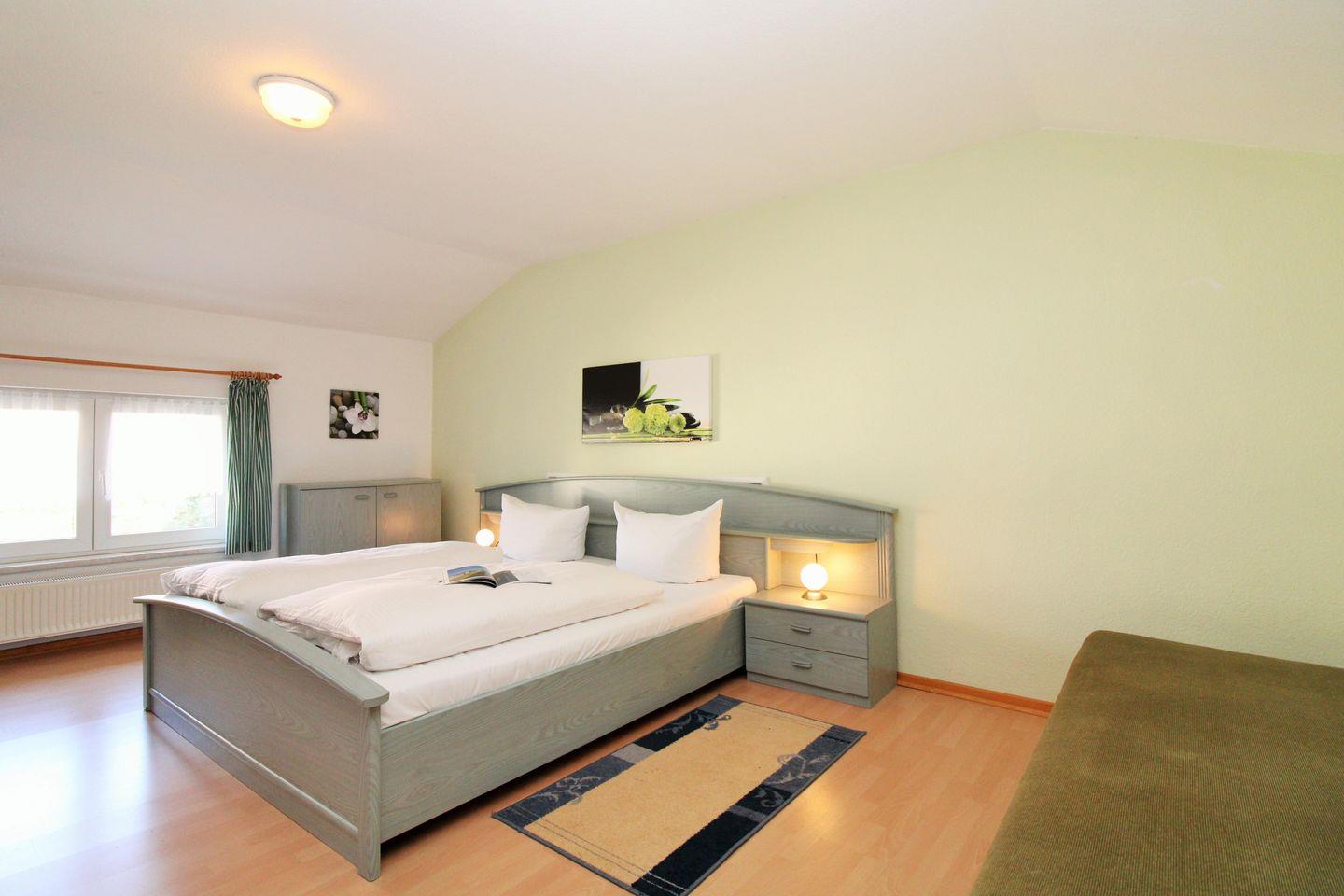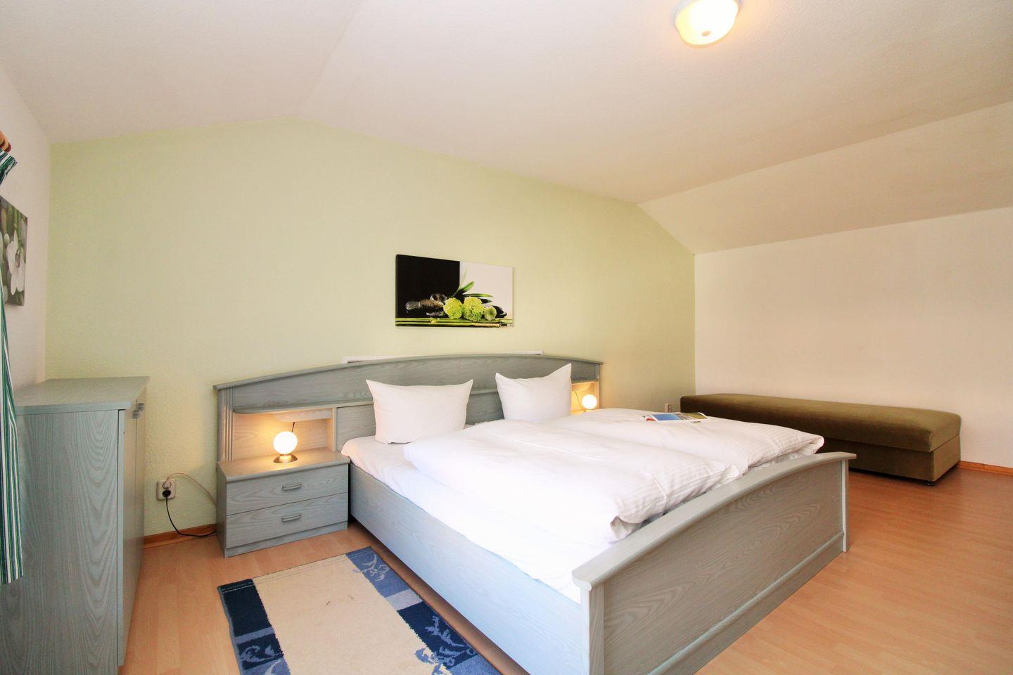 Das geräumige Schlafzimmer (im 1. OG) ist mit einem bequemen Doppelbett, Nachttischen mit Lampen, einem geräumigen Kleiderschrank sowie einer Wäschekommode eingerichtet.