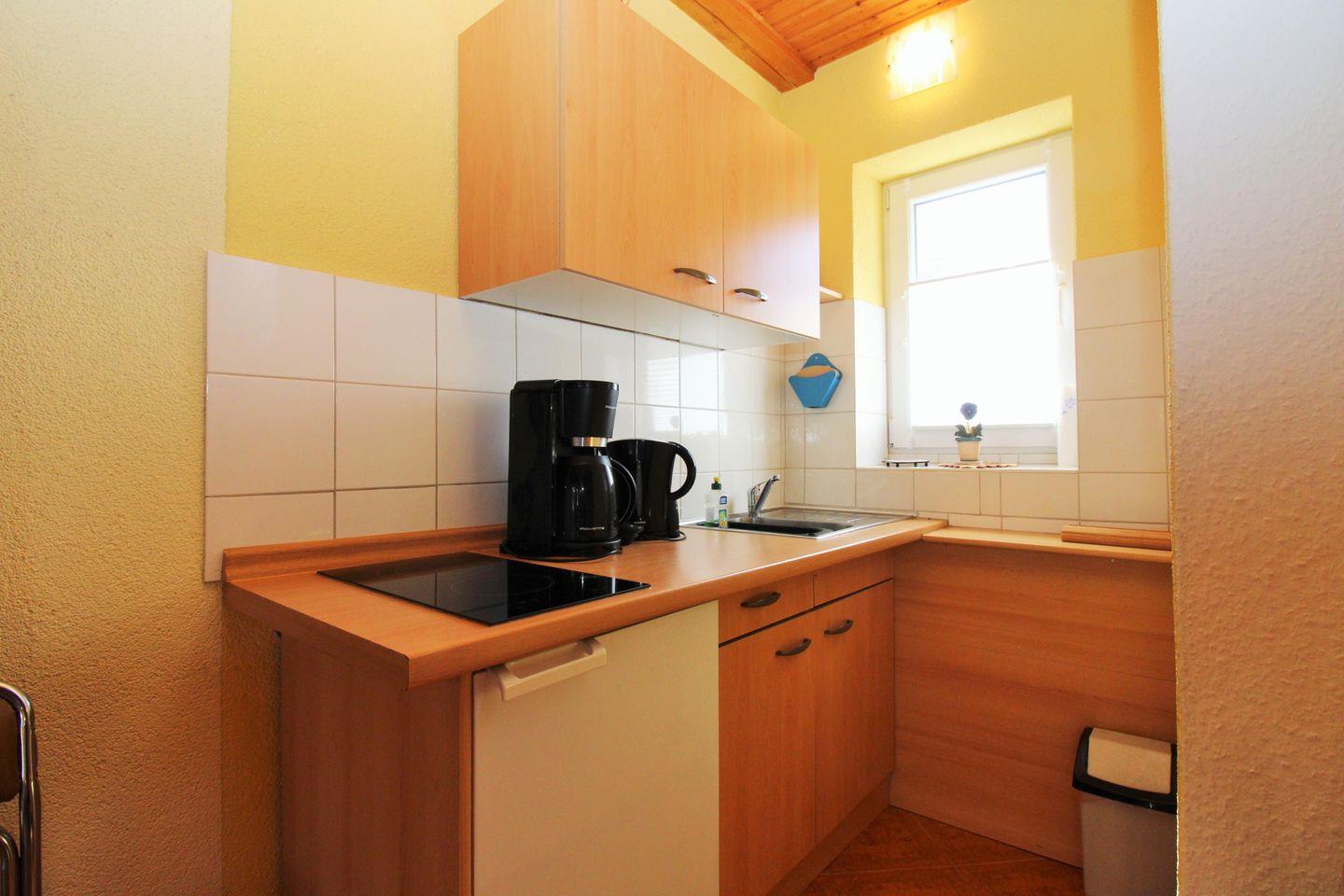 Die offene Küche beinhaltet eine Küchenzeile mit 2-Platten-Ceran-Kochfeld, Kühlschrank mit Gefrierfach, Kaffeemaschine, Wasserkocher und Toaster. Die Küche ist mit Geschirr, Gläsern, Besteck und Töpfen komplett ausgestattet.