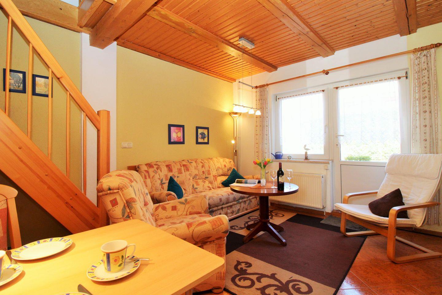 Die strandnahe und gemütliche 2-Zimmer-Wohnung (ca. 46 m²) im Erdgeschoss und 1. Obergeschoss (mit innen liegender Treppe) besitzt ein hohes Maß an Funktionalität und ist komplett eingerichtet. Der Bodenbelag im Schlafzimmer ist Holzlaminat, der Wohnbereich, die Küche und das Bad / WC sind gefliest.