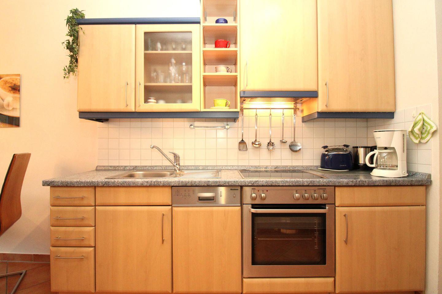 Die offene Küche beinhaltet eine voll ausgestattete Einbauküchenzeile mit 4-Platten-Ceran-Kochfeld, Backofen, Dunstabzug, Kühlschrank mit Gefrierfach, Geschirrspülmaschine, Kaffeemaschine, Wasserkocher und Toaster. Die Küche ist mit Geschirr, Gläsern, Besteck und Töpfen bestens und vollständig ausgestattet.