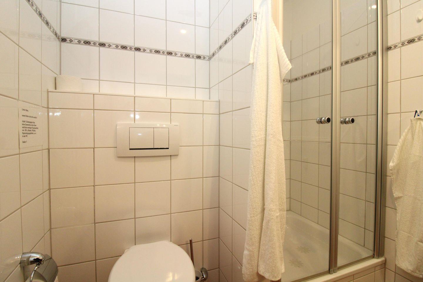 Das freundliche Badezimmer verfügt über eine Dusche, Waschbecken und WC, Föhn, Kosmetikspiegel, einen kleinen Badezimmerschrank sowie ausreichend Ablagemöglichkeiten.