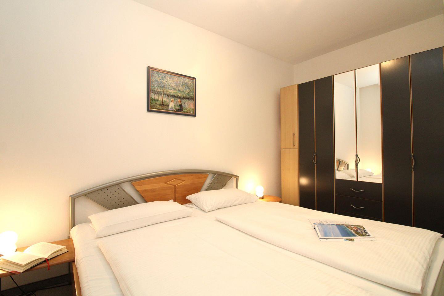Das gemütliche Schlafzimmer ist mit einem bequemen Doppelbett (2x90x200), Nachttischen sowie einem geräumigen Kleiderschrank eingerichtet. Eine zusätzliche bequeme Schlafmöglichkeit für eine weitere 3. Person bietet die ausziehbare Schlafcouch im Wohnzimmer.