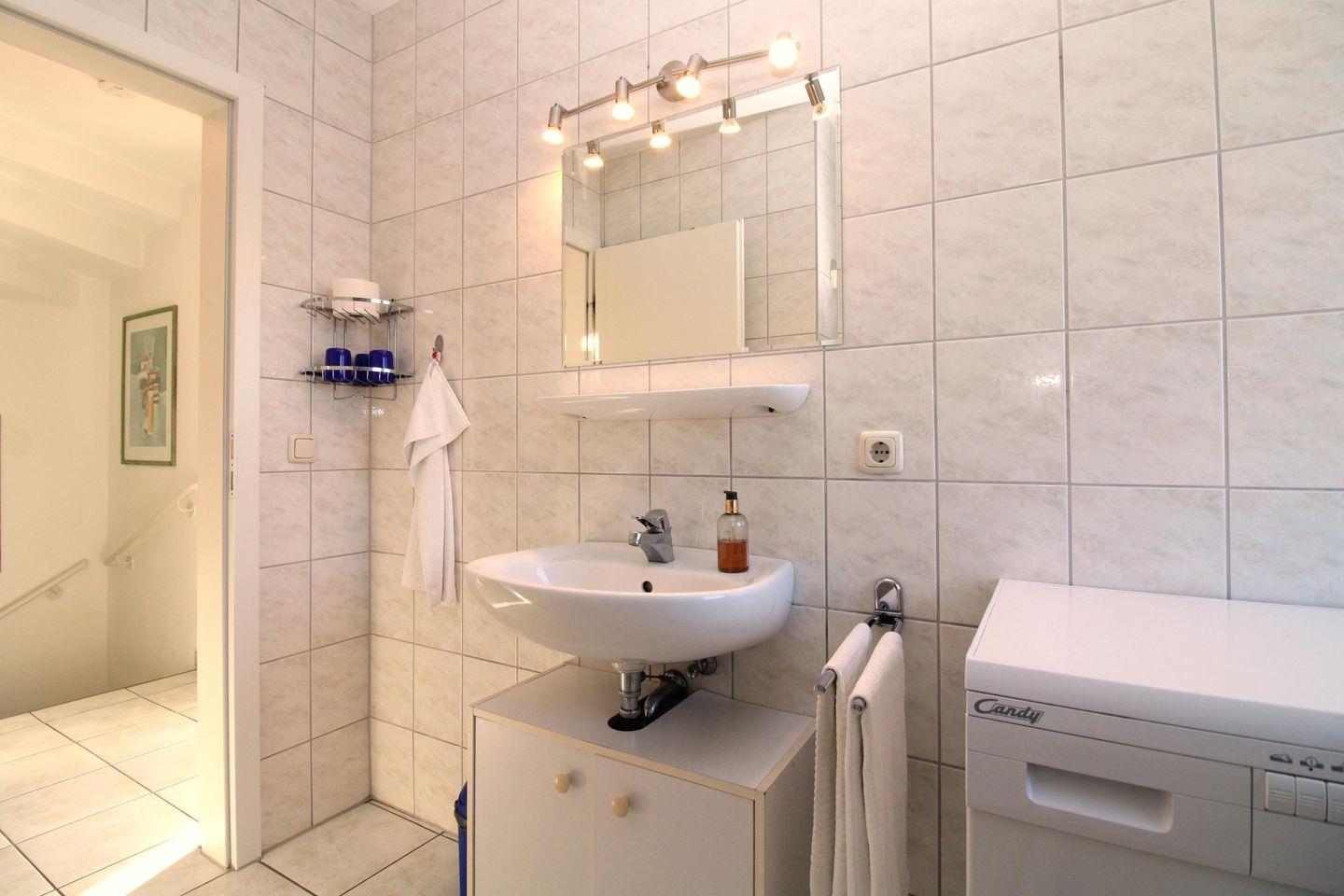 Das helle Badezimmer (mit Tageslicht / Fenster) verfügt über eine Dusche, Waschbecken mit Unterschrank, WC, einen Föhn sowie einen Kosmetikspiegel. Die sich hier befindliche Waschmaschine kann von den Gästen kostenfrei mitbenutzt werden.